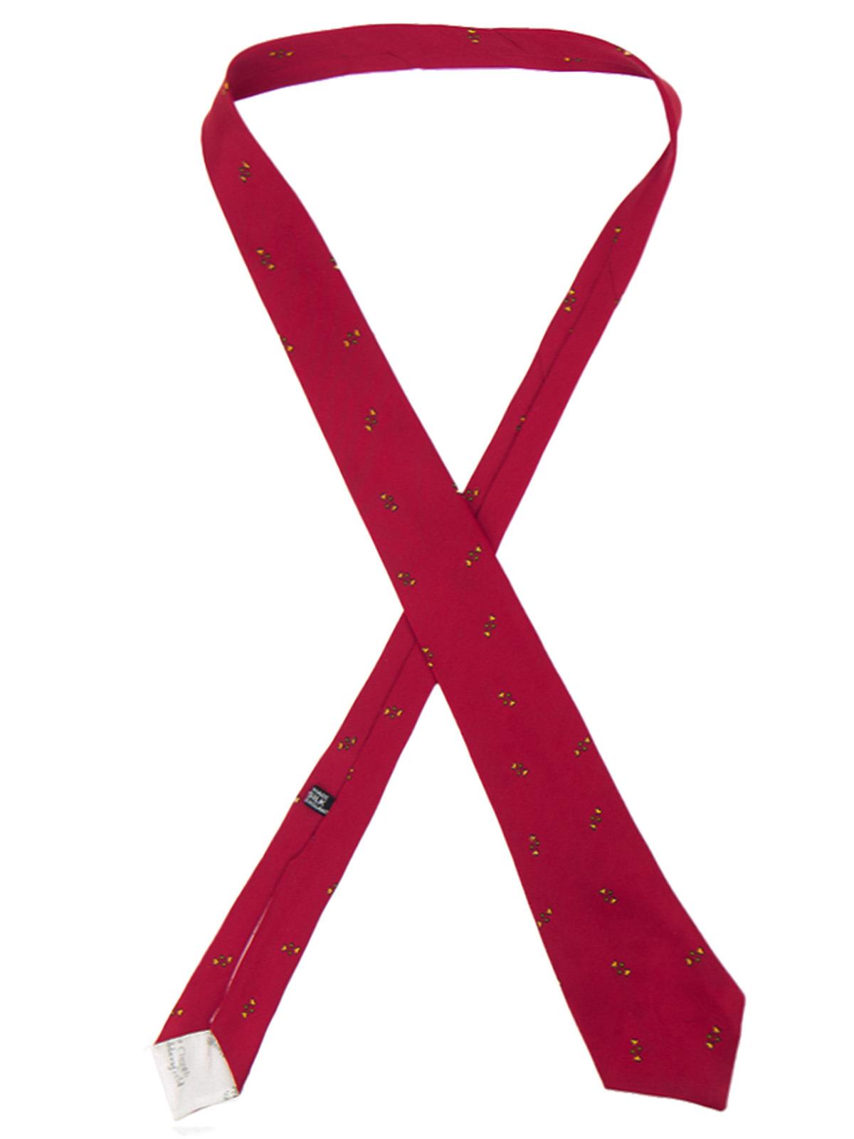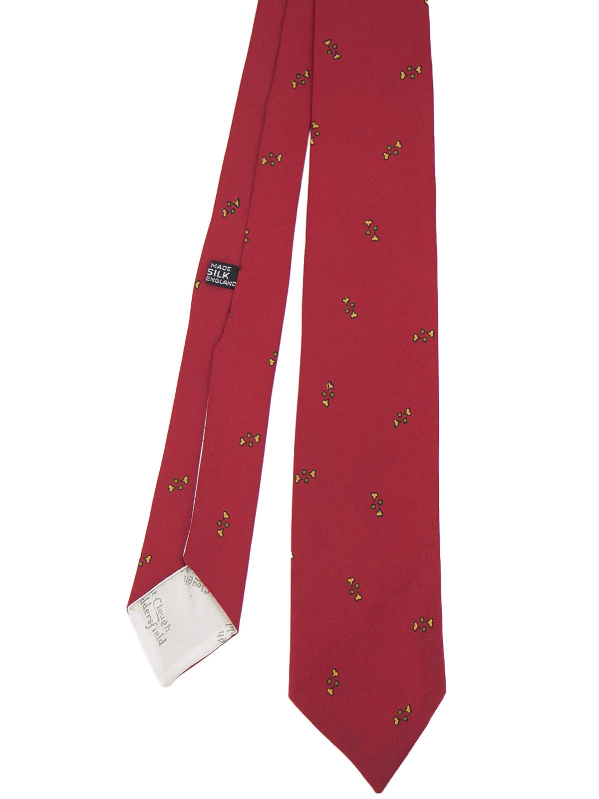 A 1950s original handmade silk tie, made in our very own Huddersfield by Ernest Clough. This is a dark red tie with a sweet small yellow heart and green dot motif throughout and a branded white lining. A narrow, period tie that will be sure to liven up any midcentury shirt!