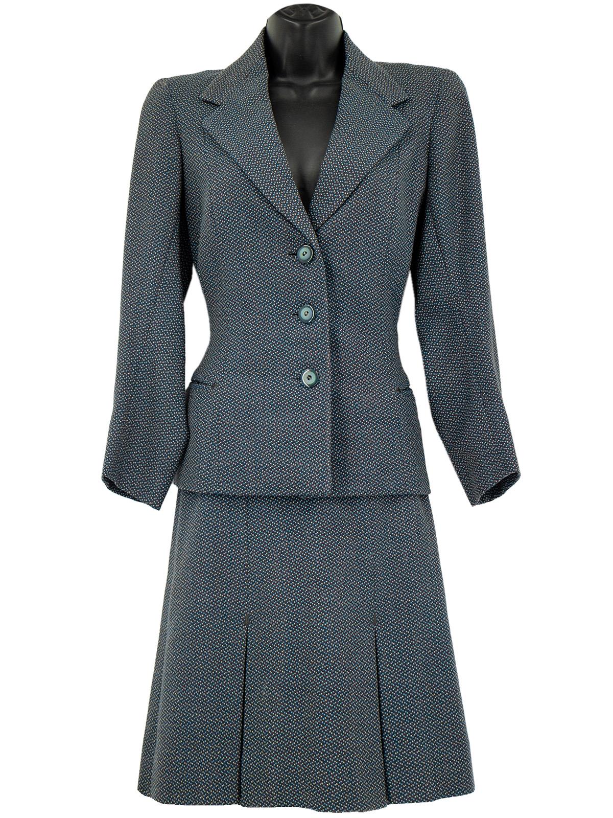 A 1950s navy blue spotty skirt suit lined in a light grey satin. There are two buttons to the cuffs, two feature pockets with embroidered darts to the edges and a three-button front.