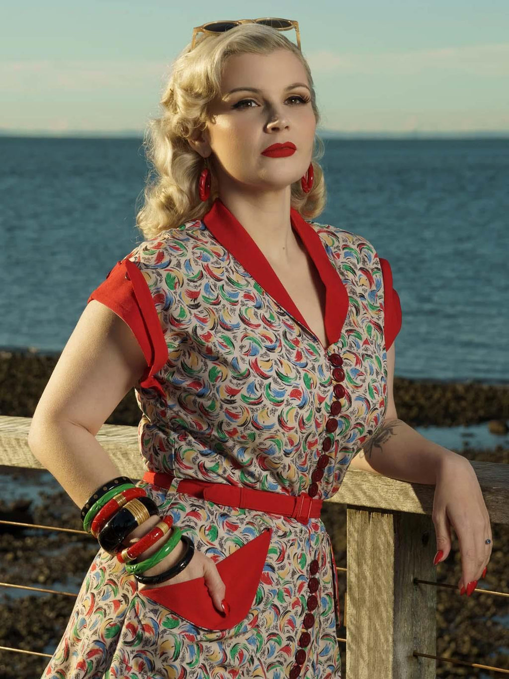 An exact copy of an original 1950s day dress, with superb retro details like the front buttons, oversized patch pockets and arm pleats.
