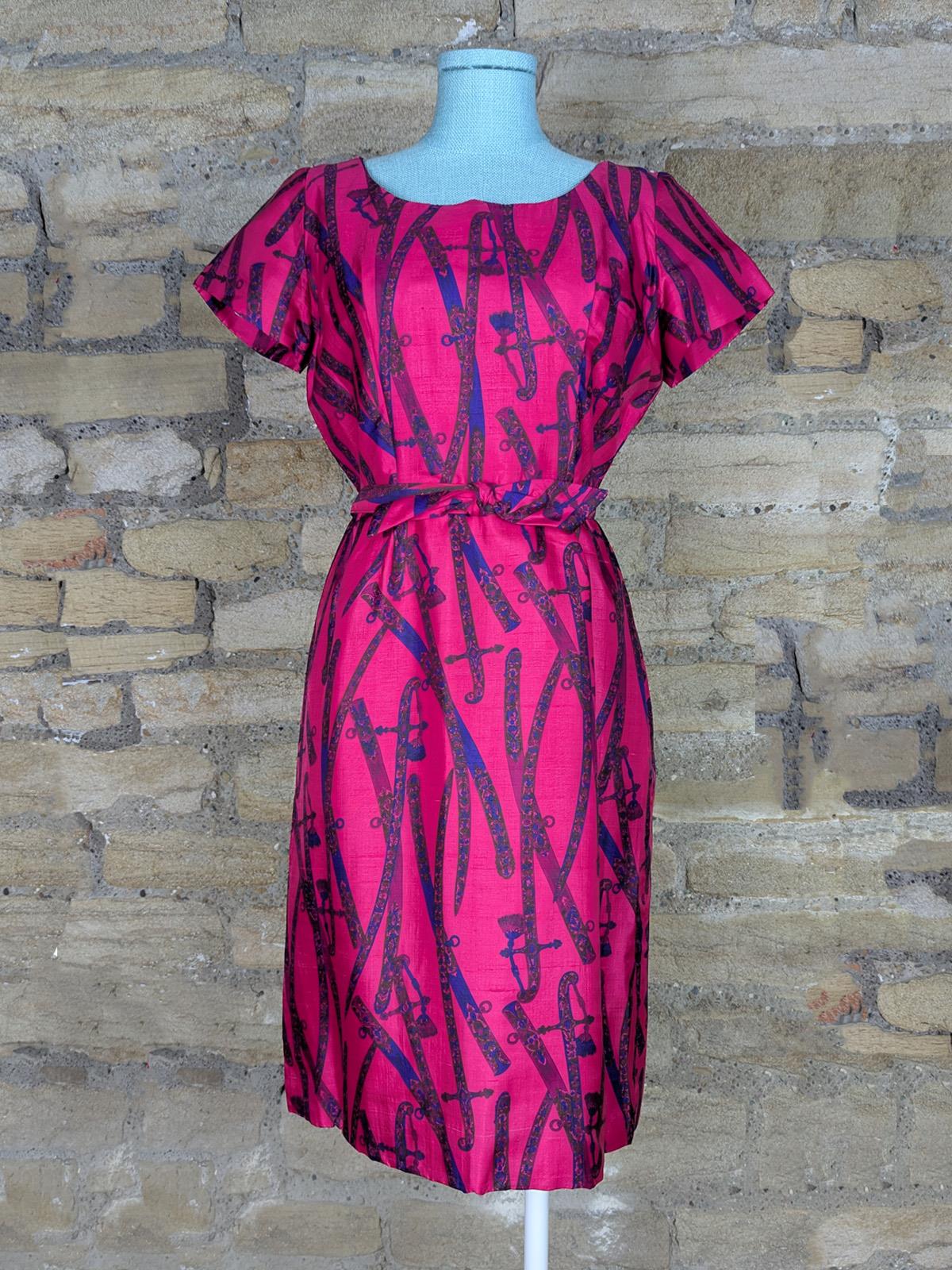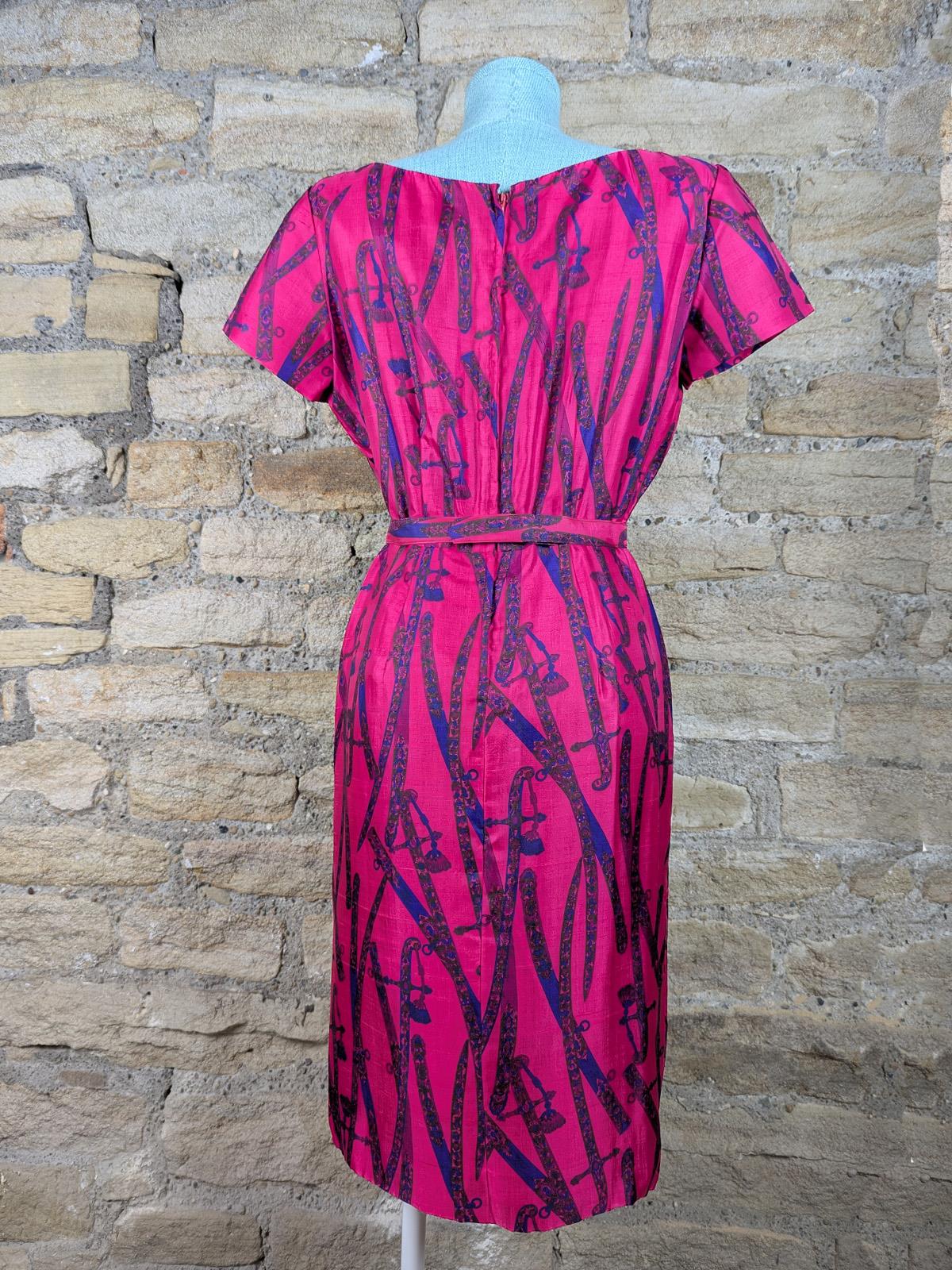 Lightweight slub silk dress with a crossed sword design. Shaped scoop neckline and pretty bow belt with press studs at the back.