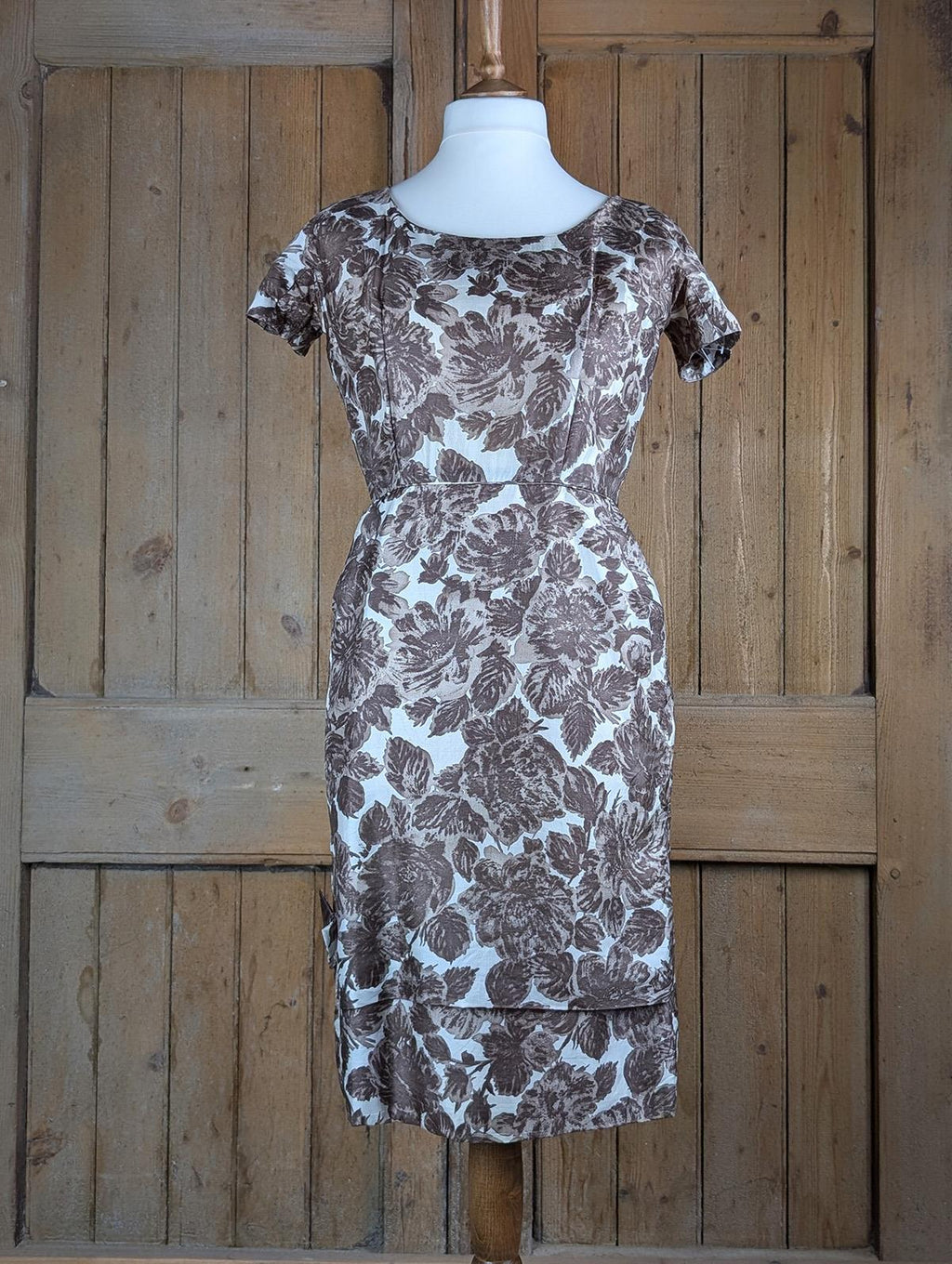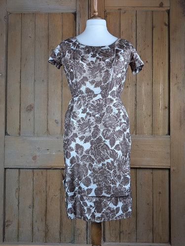 Vintage 1950s Taupe Floral Faux Silk Waisted Shift Dress