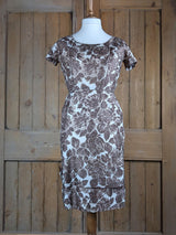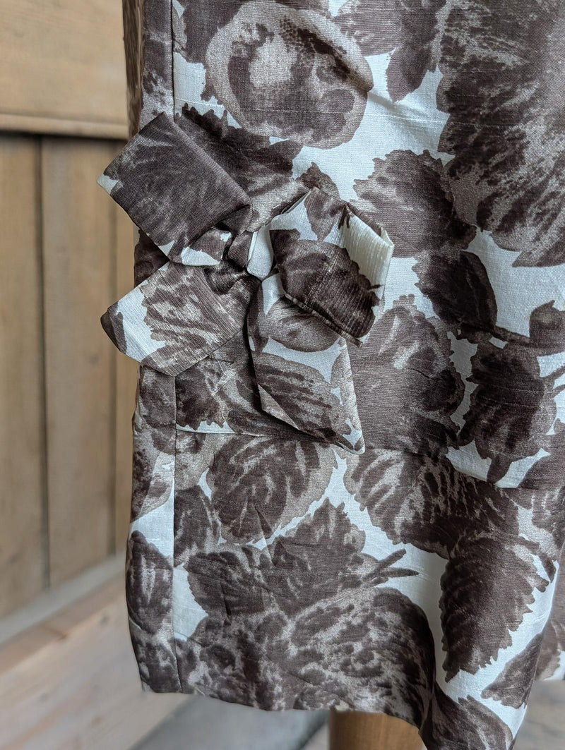 A beautifully dressmaker-made faux silk dress printed in a pretty taupe floral pattern. There is a feature rosette/bow to the right hand of the skirt and aa double layer to the hem.