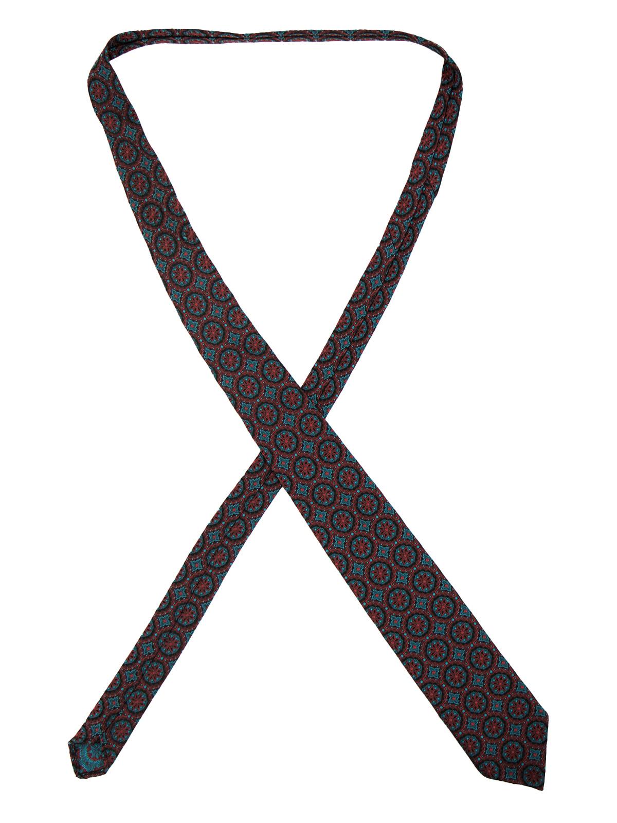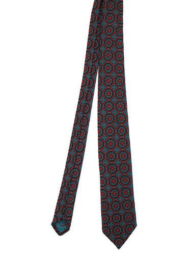 A 1950s "Westminster Tootal" tie made in England. An intricate pattern of stunning turquoise blue and dark red with black tracing. Made from terylene.