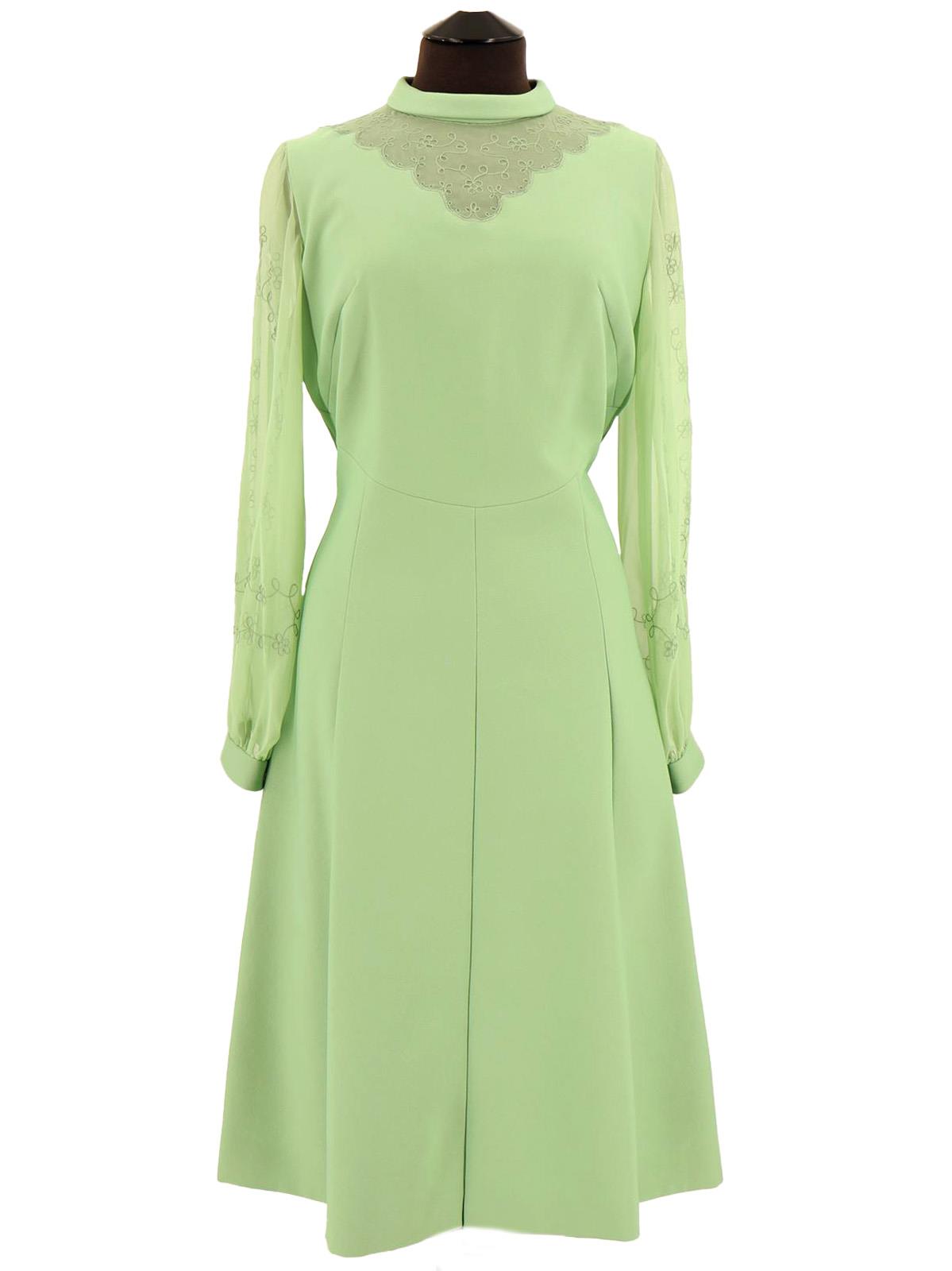 The dress's design features sheer sleeves and a sheer scalloped panel on the bodice, which is decorated with embroidered floral trim that gives a delightful feminine touch. The dress has a simple roll neck, long bishop sleeves and a high, curved waist seam. It's fastened with a back zip.