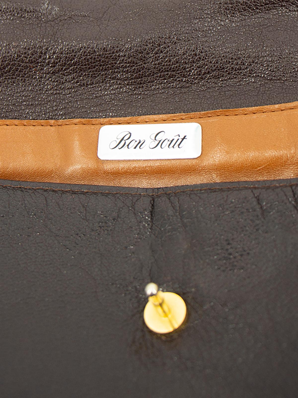 A vintage 1960s "Bon Gout" brown faux leather shoulder bag. Fabulous stylised gold hoop fittings to the shoulder strap & matching gold twist lock. There are two large compartments inside, a large zip pocket, an envelope pocket and pen holder! Lined in tan faux leather.