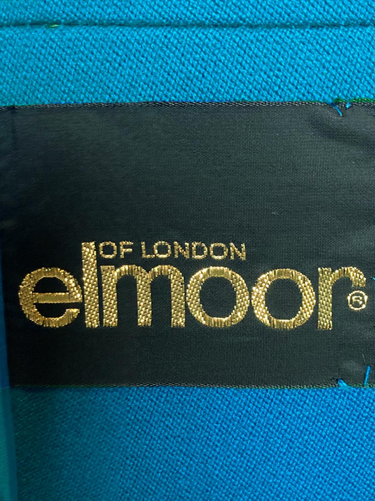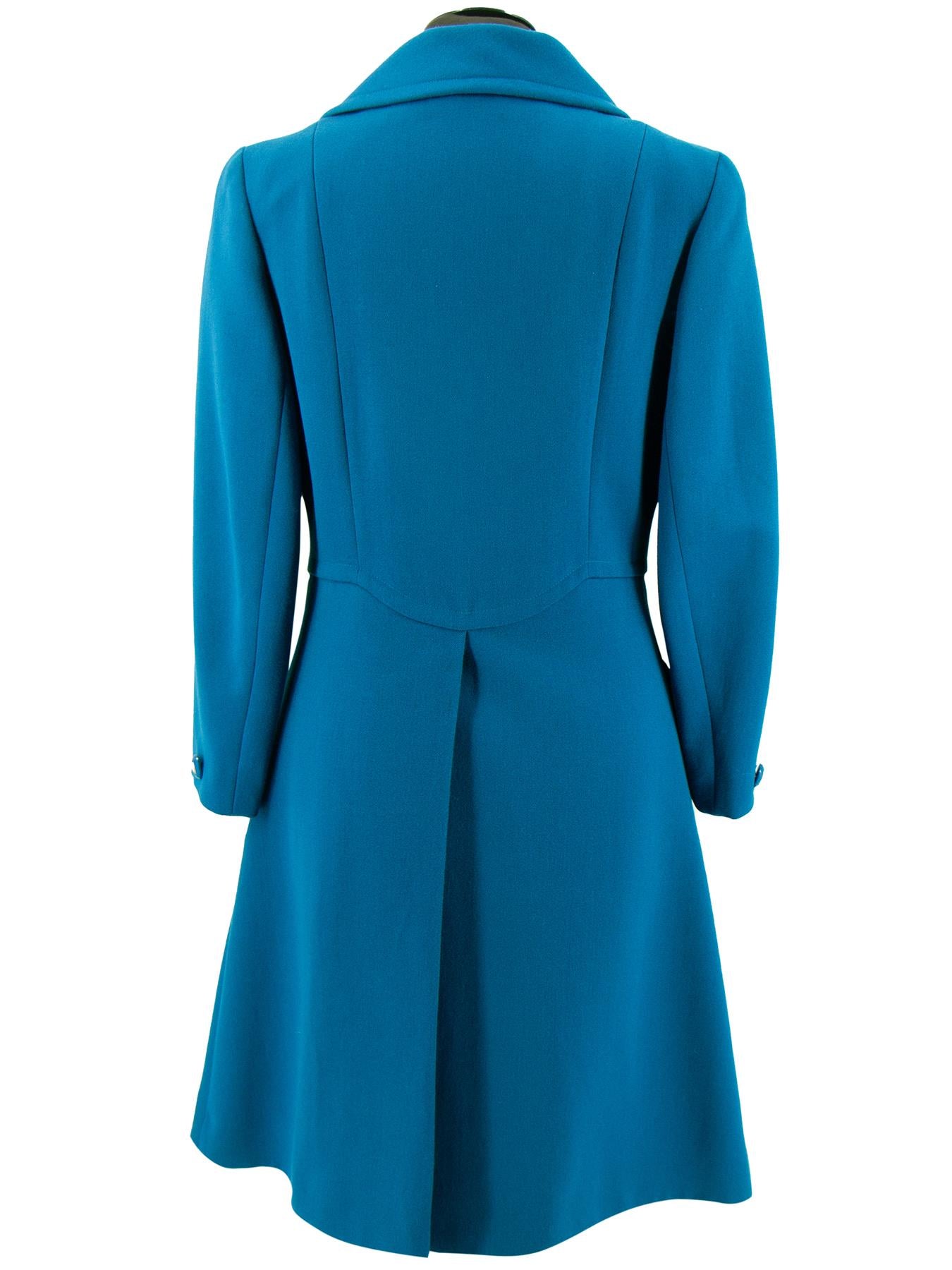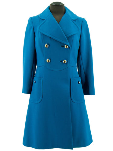 A wonderful teal-coloured original vintage coat by "Elmoor of London". This is a double-breasted design with original oversize matching gold and teal perspex buttons to the front, cuffs and pockets.