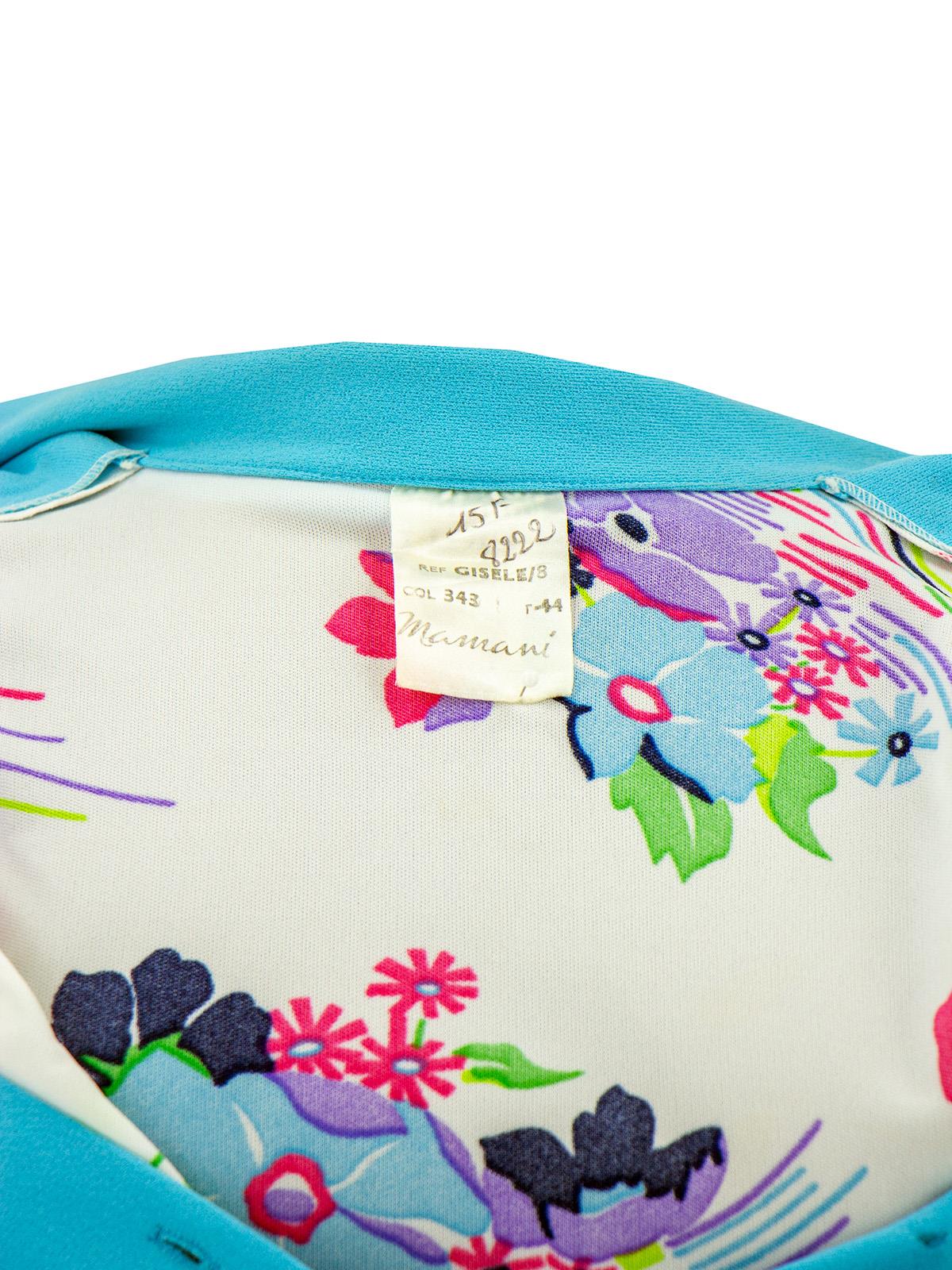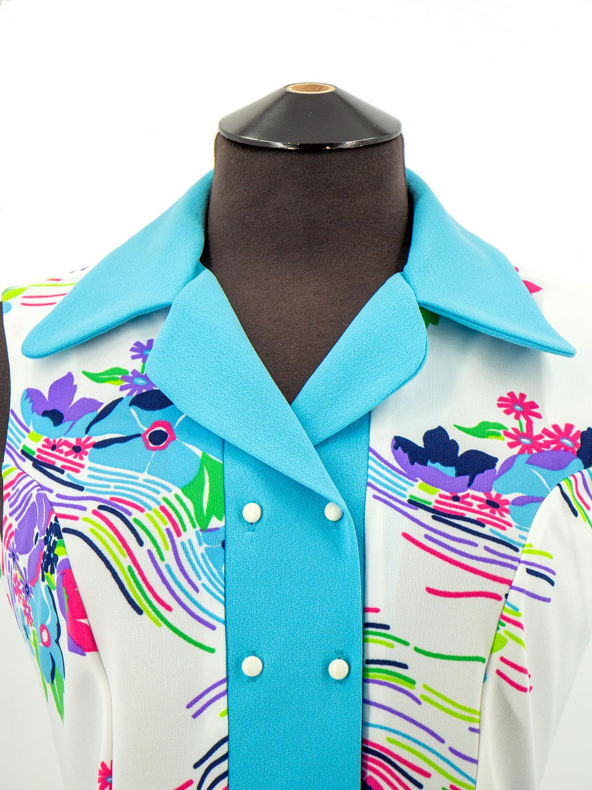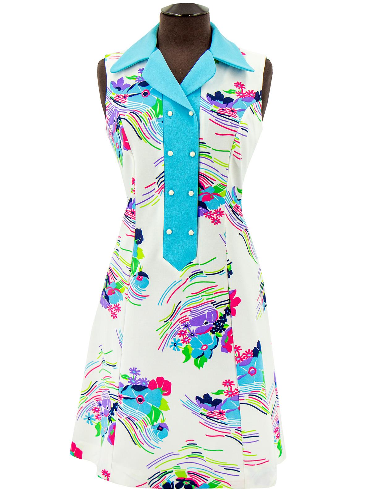 Period wide collars, contrasting white buttons on a vivid blue front placket and A-line skirt. 100% polyester.