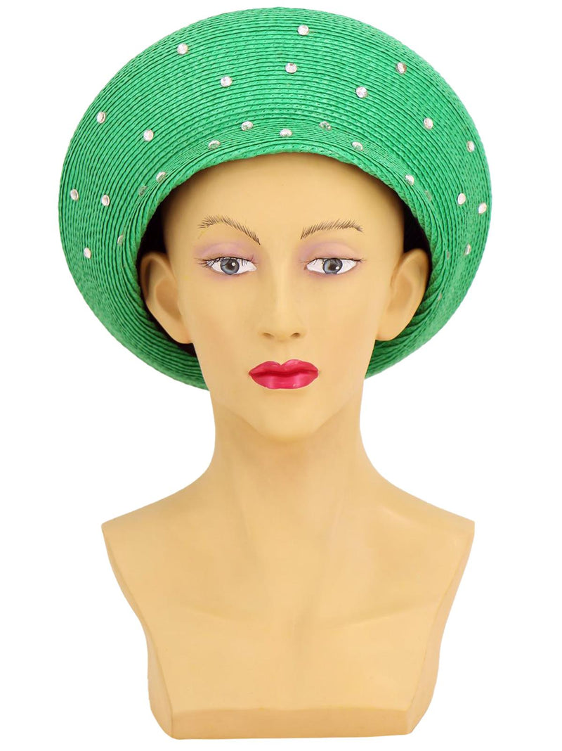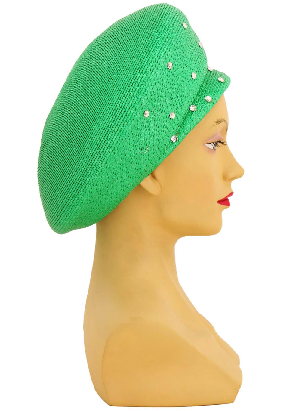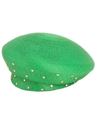 Super chic 60s straw hat, realised in a rounded beret shape and decorated with diamante gems. Beautiful jade green shade.