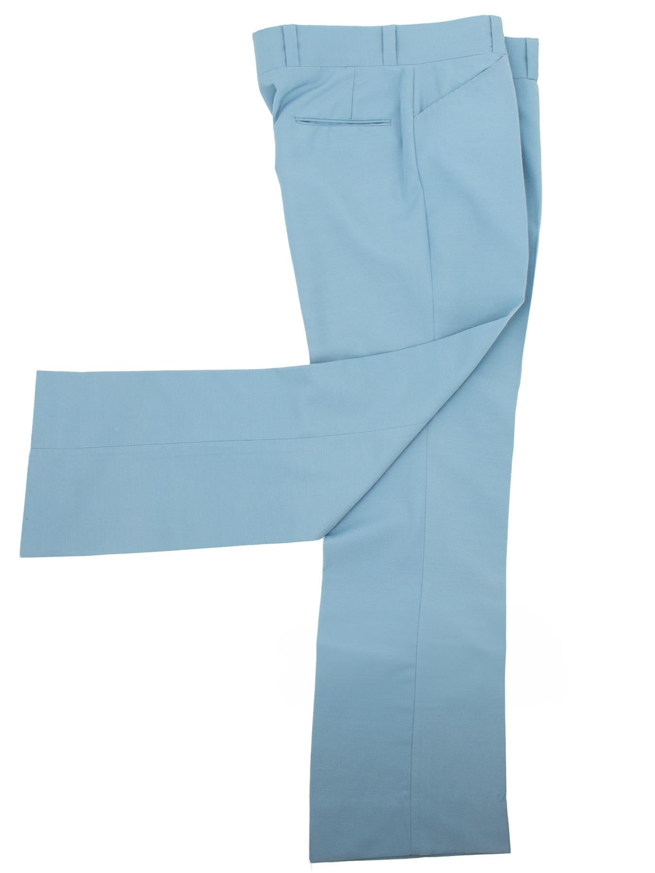 The trousers have a classic travelers crease to add sharpness and sophistication to the look, with two back pockets, two side pockets, and an extra wide waistband for vintage belts The trousers also have a 3" hem, so could be altered to suit a taller gentleman.