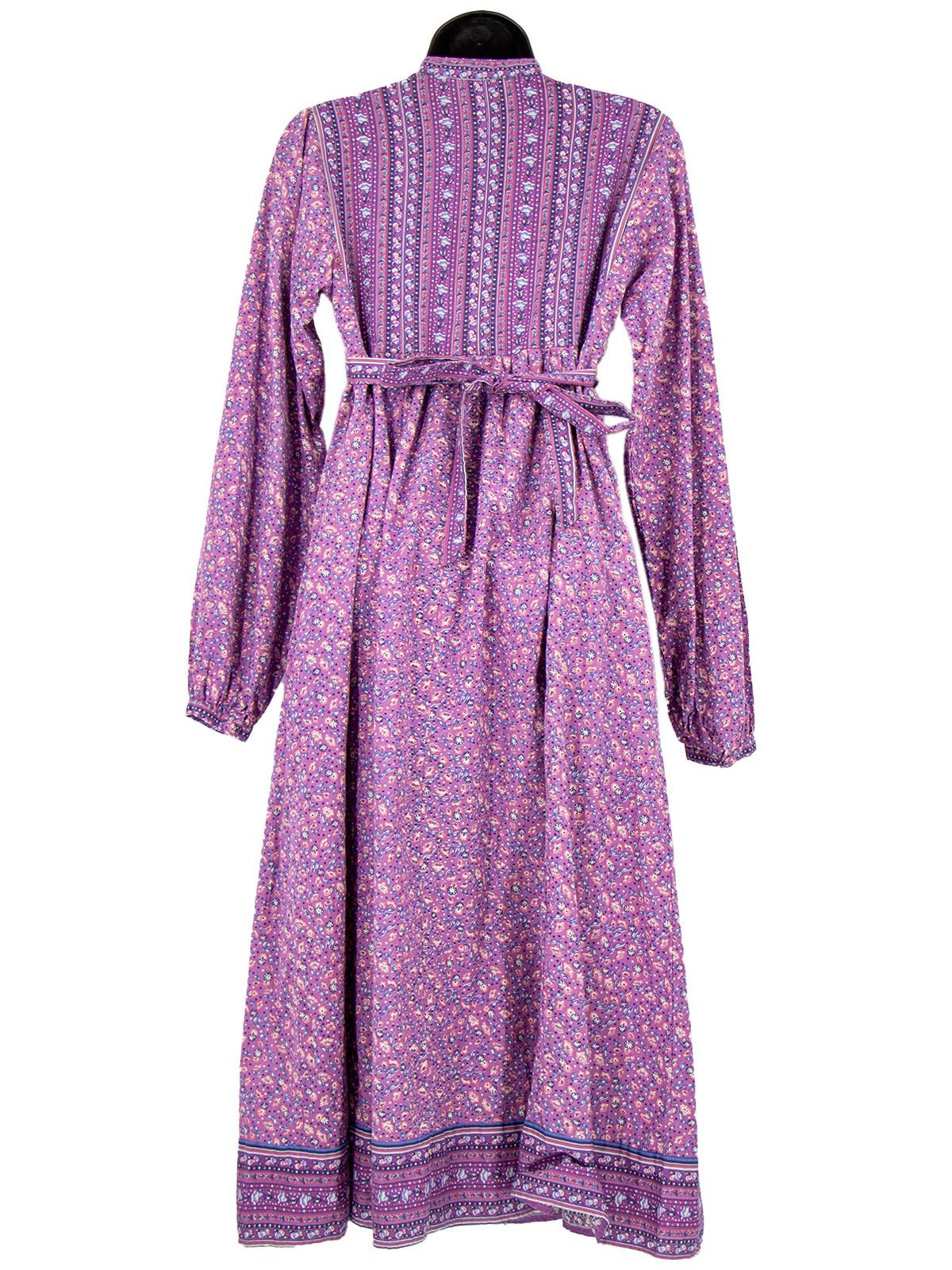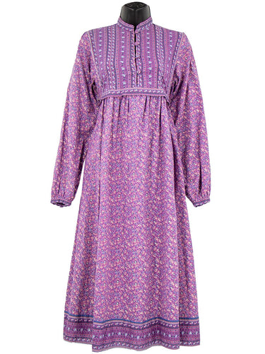 A vintage 1970s Indian cotton dress with stand collar. In wonderful tones of lilac, pink and blue in a pretty bohemian floral print with tuck detail, button & loop to the chest, and a tie in matching fabric under the bust to highlight the figure.