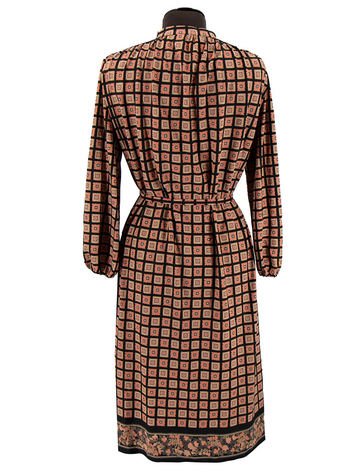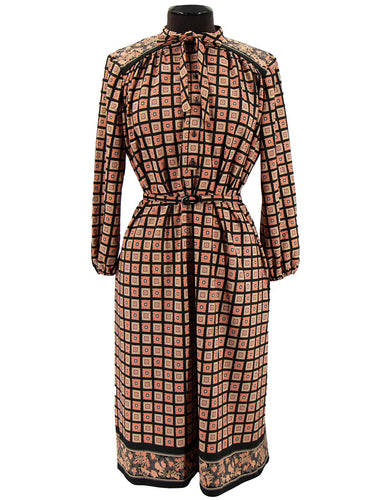A pink, peach and black 1970s original day dress from House of Lerose, Holland. This dress has an abstract square pattern throughout with floral borders to the shoulders and hem. There is a feminine tie to the neck and small black globe buttons to the chest. There is also a matching belt to cinch the waist and elasticated cuffs.