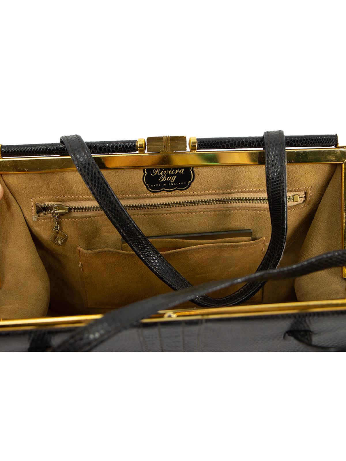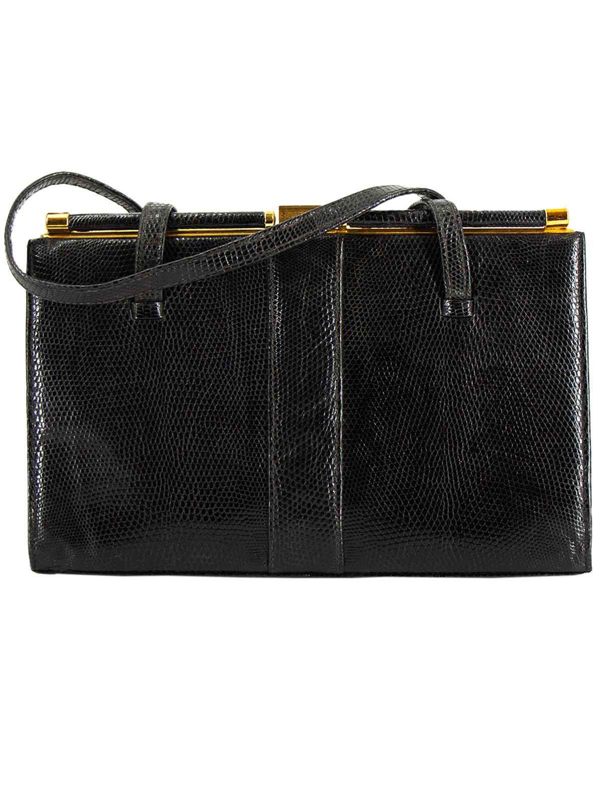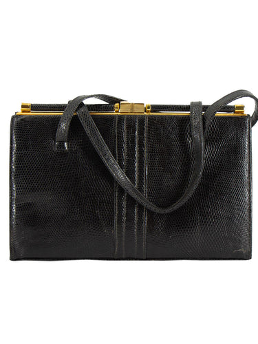 Vintage black lizard skin gold frame bag. This classy vintage accessory features two top handles, gold frame, and gold clasp closure.