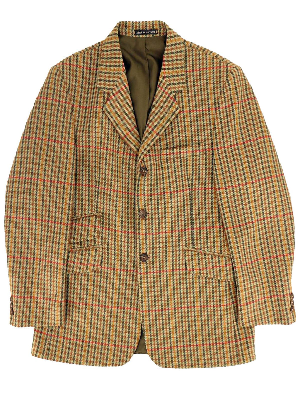 Neutral-toned vintage jacket with a bold check pattern in green, red, tan, and ochre.