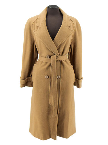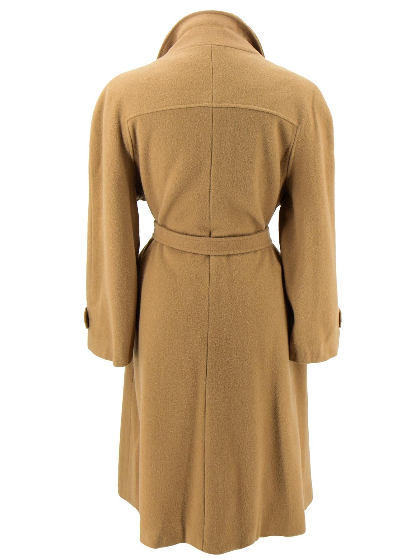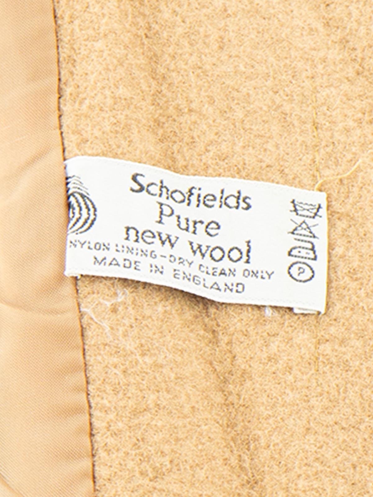 A true vintage, pure new wool coat in classic camel. This coat is made by Schofields in England and is full-length to keep you warm all winter. Featuring matching camel buttons, belted cuffs and a waisted belt. This vintage coat is fully lined. There are some minor points of wear on the exterior of the coat as shown in the photos.