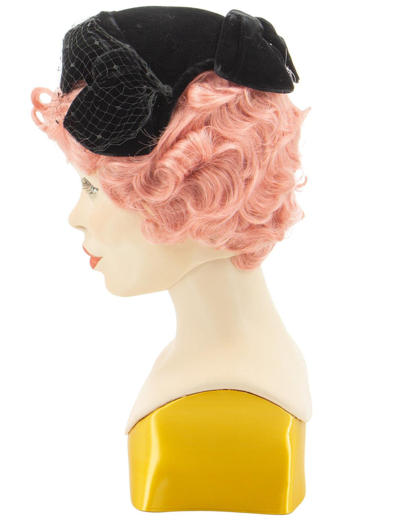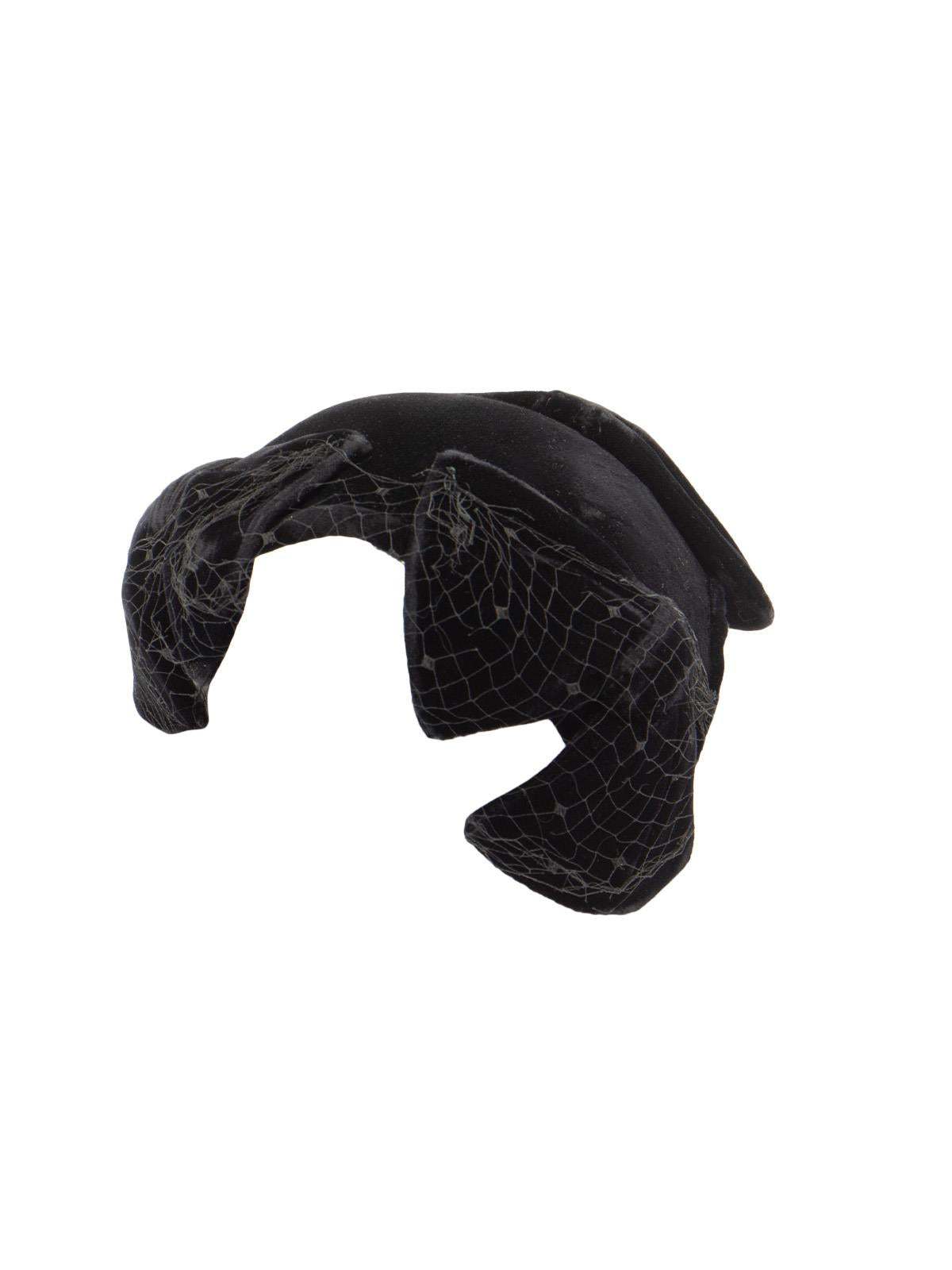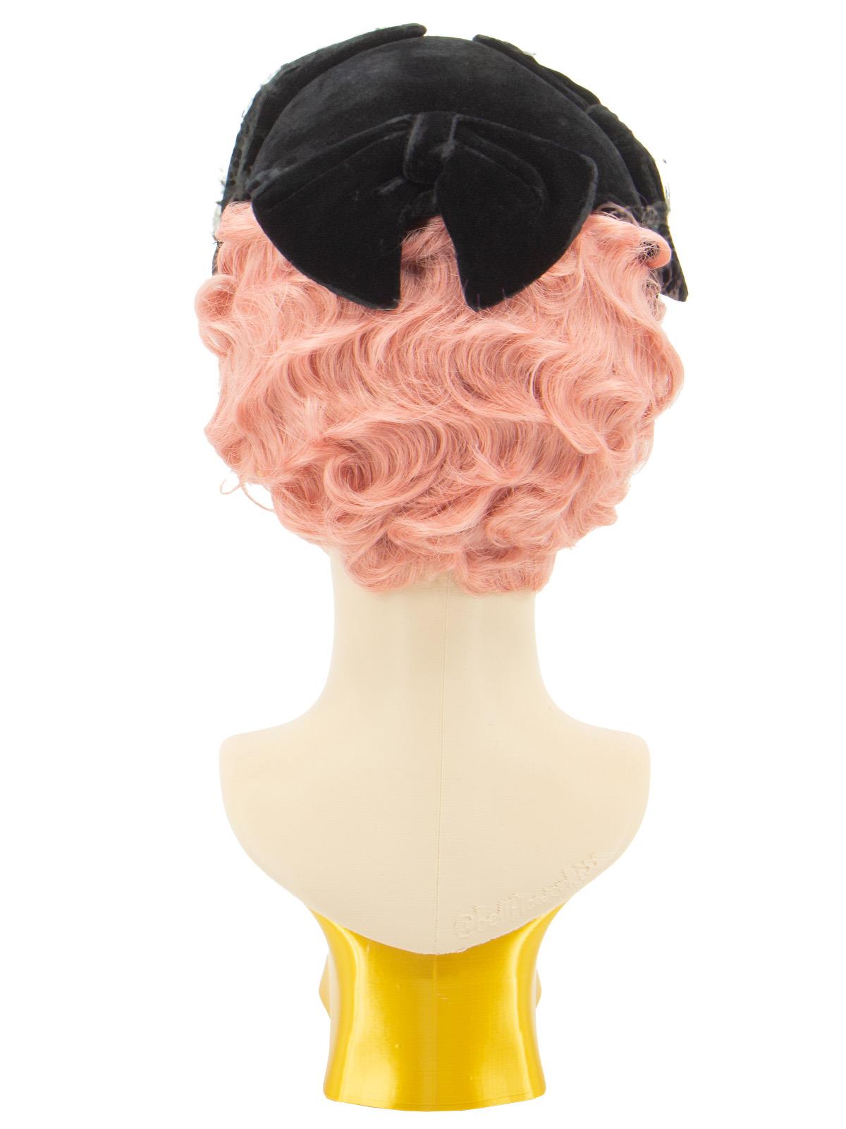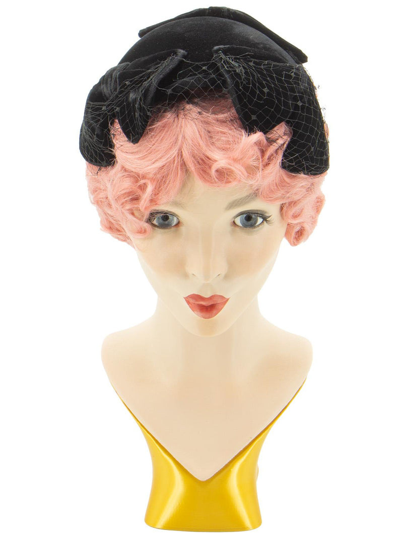 Vintage black velvet, Clover Lane, casque hat, adorned with 3 large bows and a netted veil.