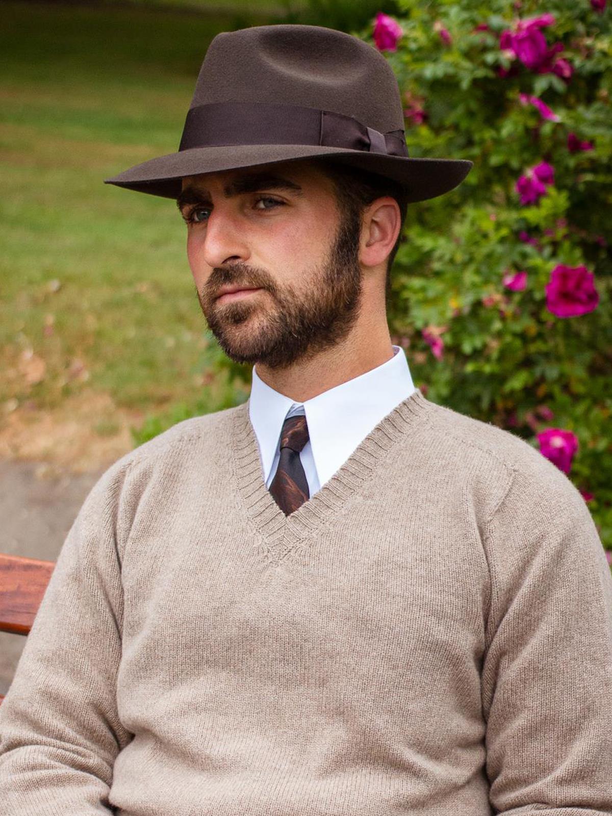The vintage dark brown 1940s style Mayfair fedora is a timeless classic featuring a snap brim and a rich chocolate brown grosgrain hatband, finished with an elegant double ribbon tail to one side.