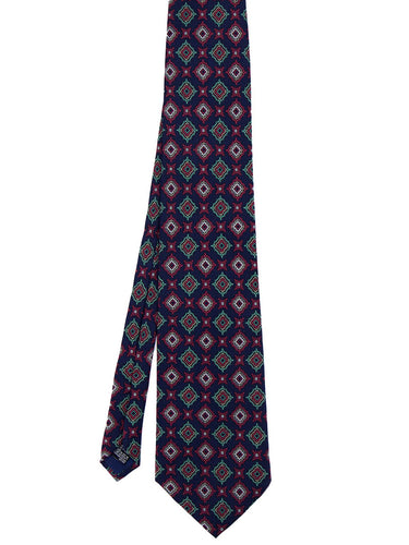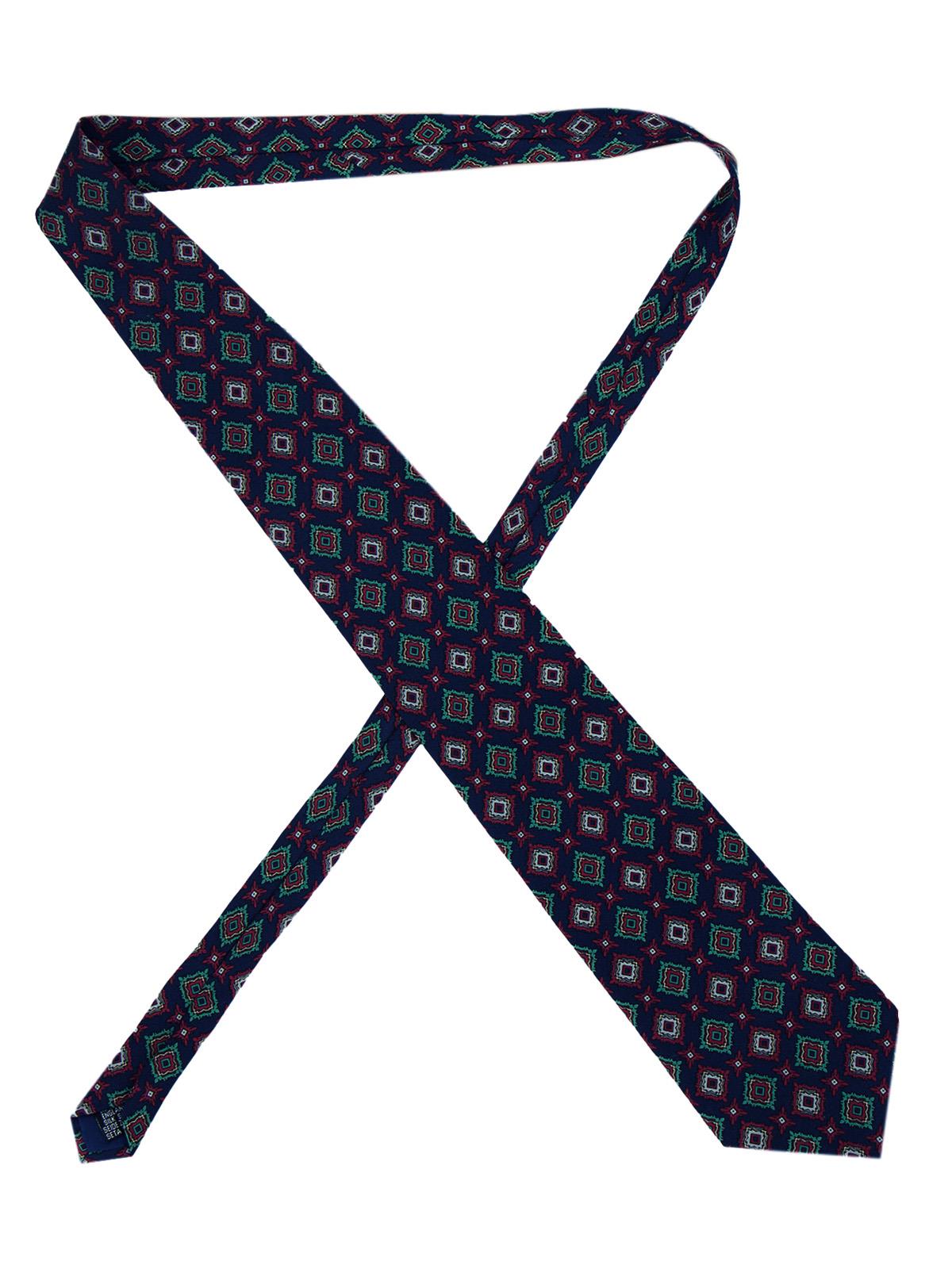 A vintage silk tie in a diamond-style pattern in navy, mint green and dark red. Classic tones to recreate a vintage look.