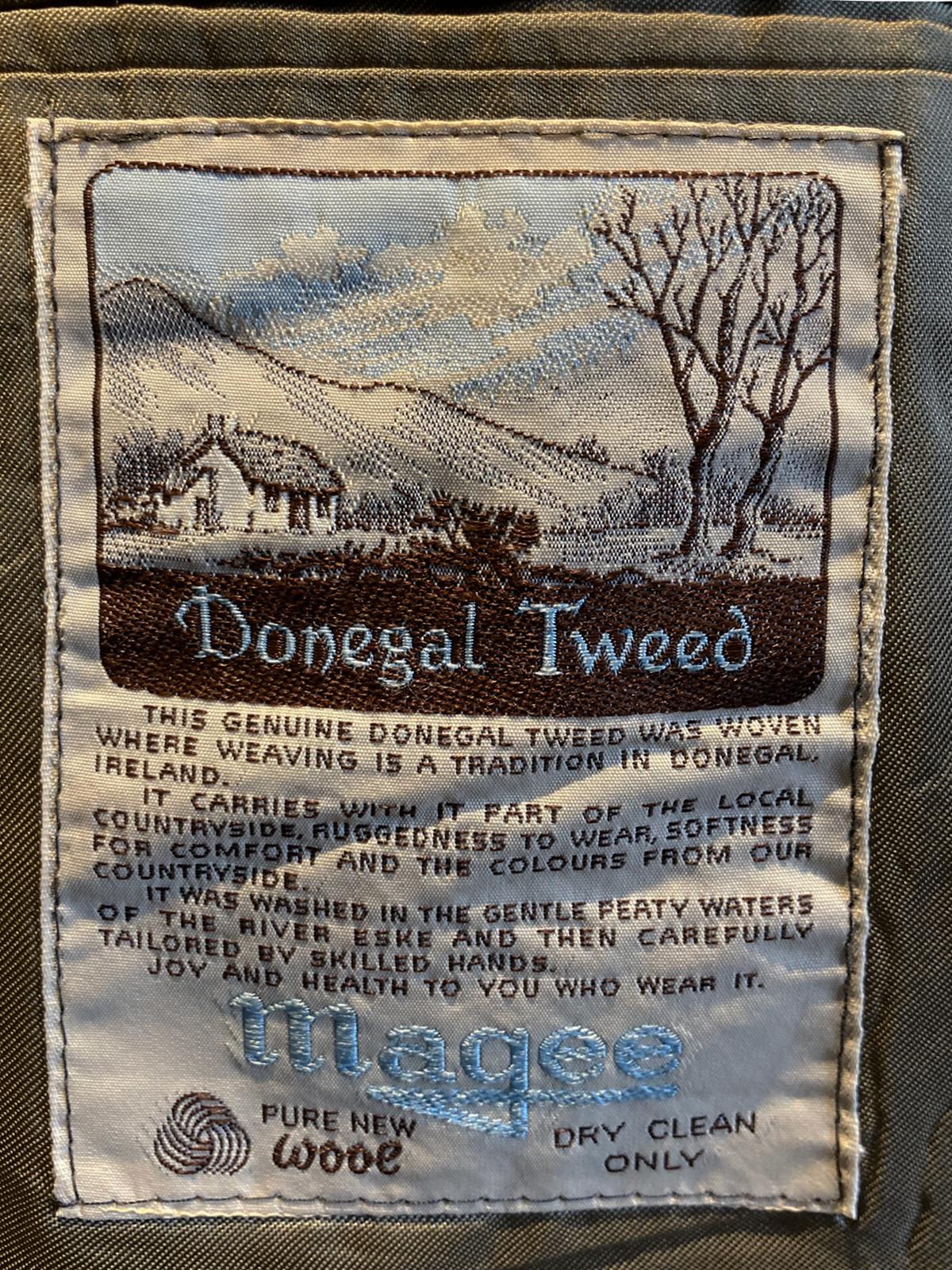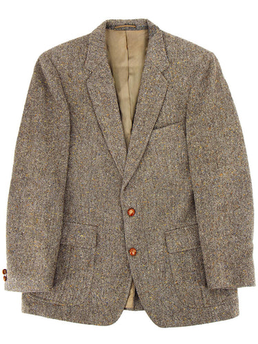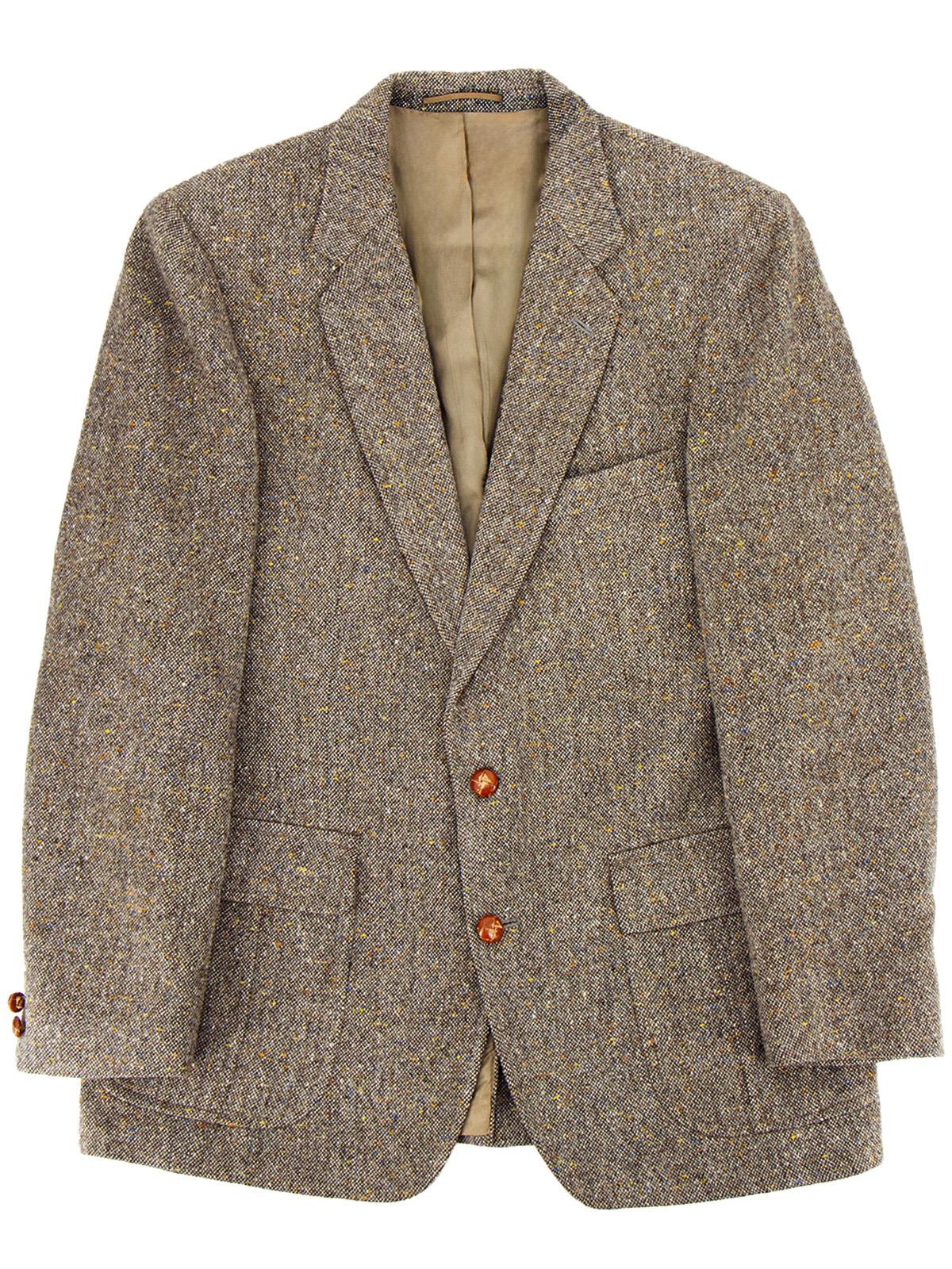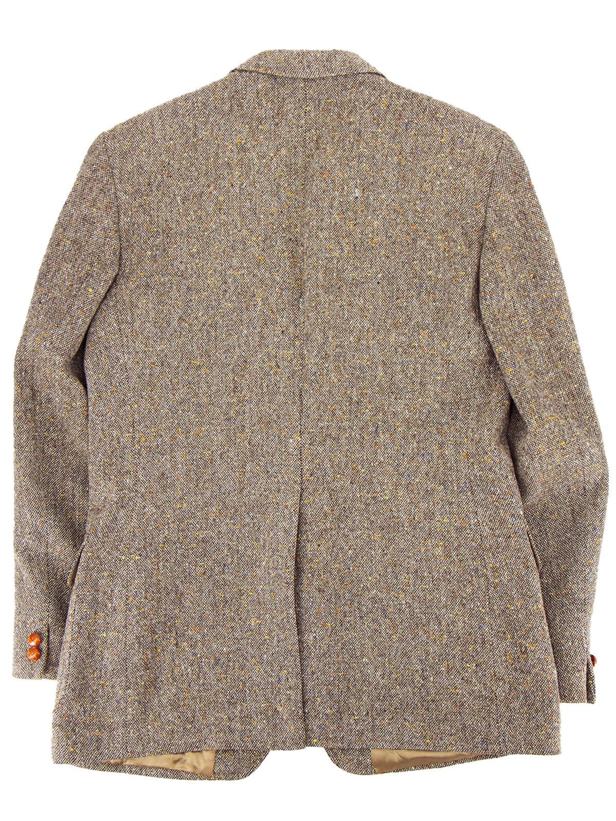 A wonderful high quality 100% pure new wool Donegal tweed jacket, woven in Ireland by Magee. A traditional mid-brown overall hue with slubs of blue, yellow, tan and cream. Genuine original leather football buttons to front and cuffs, two patch pockets, four internal pockets and a back vent.