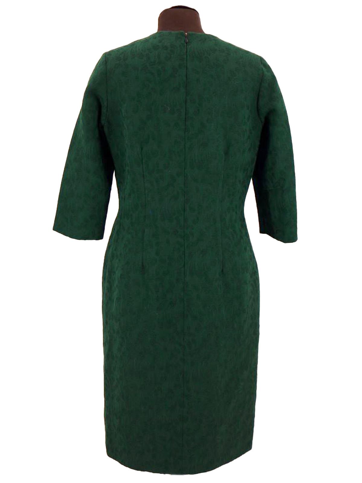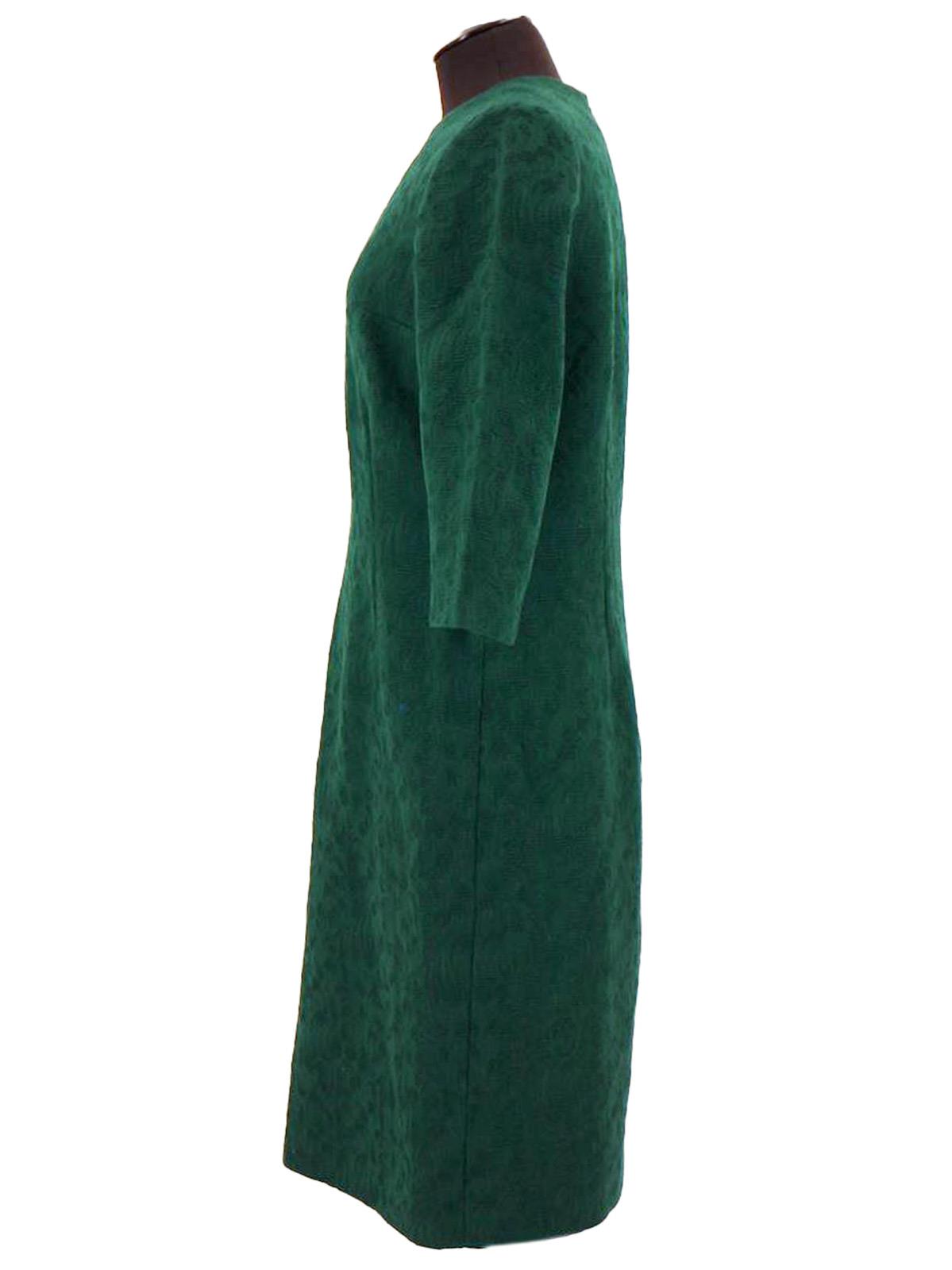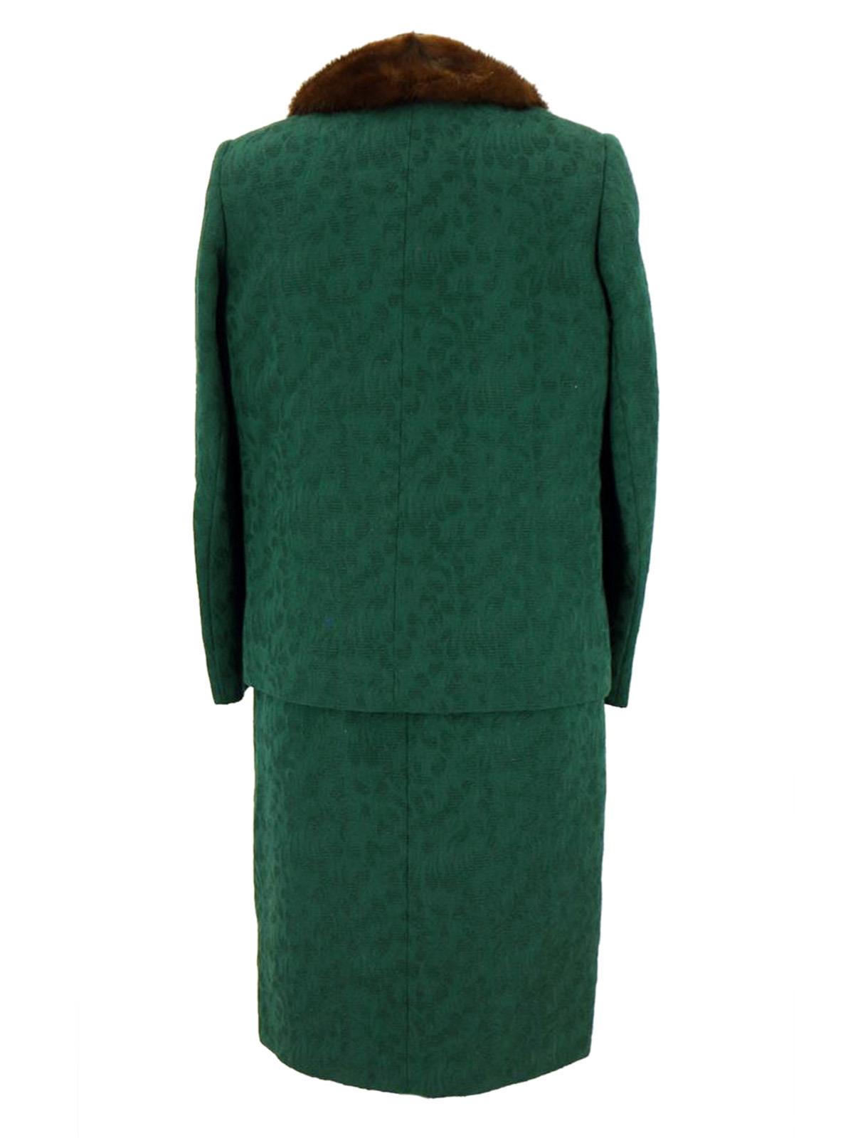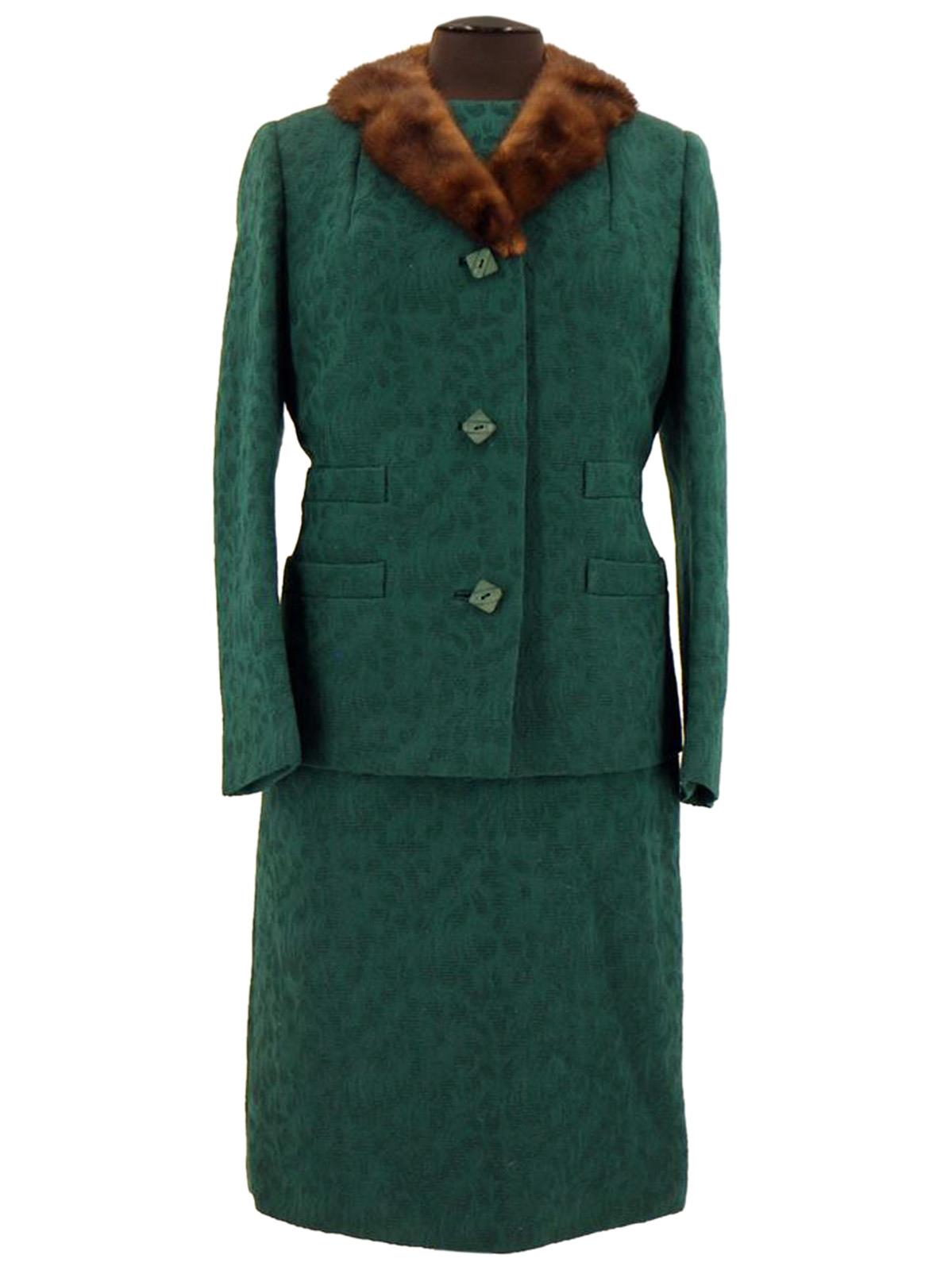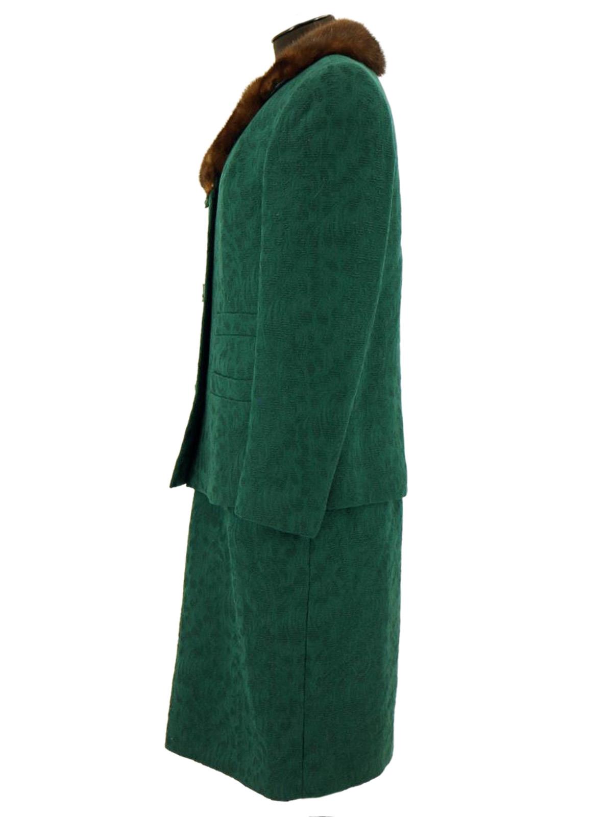 This true vintage suit consists of a dress and matching jacket. Made of worsted wool with a textured pattern in a deep emerald green shade, with brown mink fur trim on the jacket's collar.