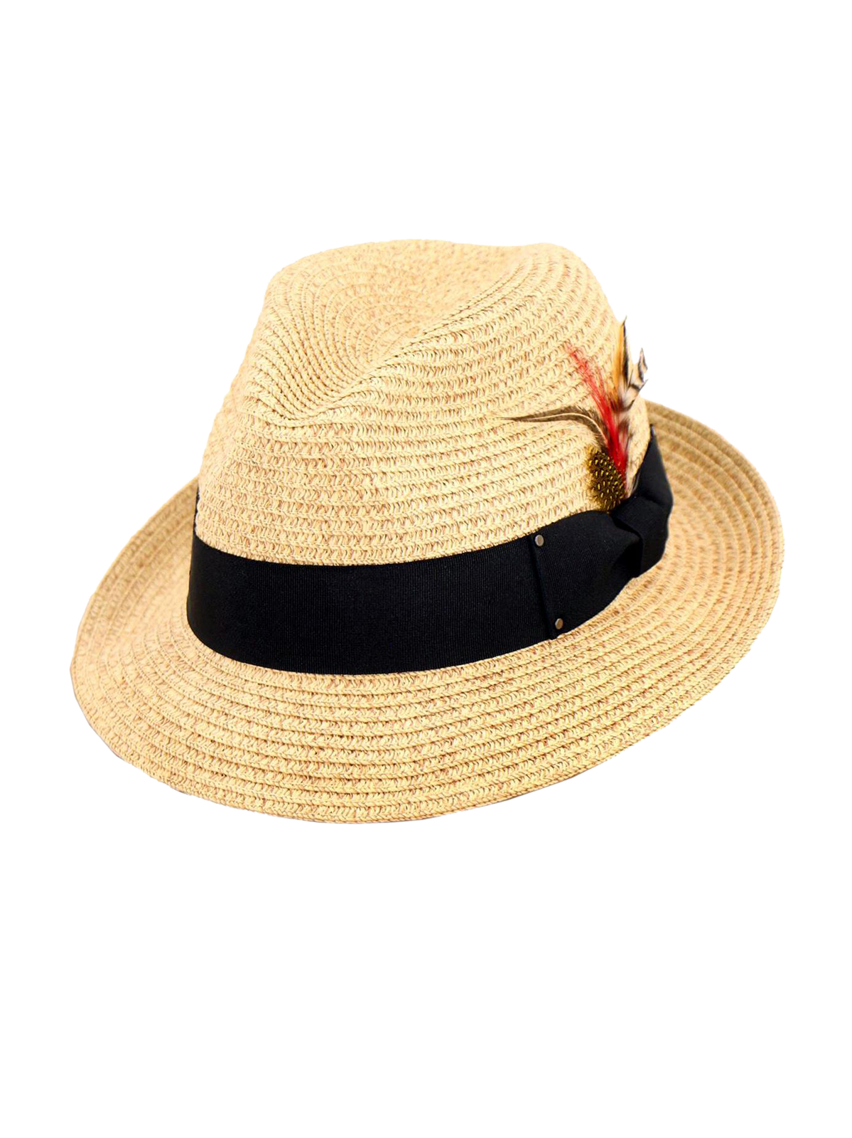 Neat black hatband with feather trim. C crown. The brim is slightly upturned all the way around.