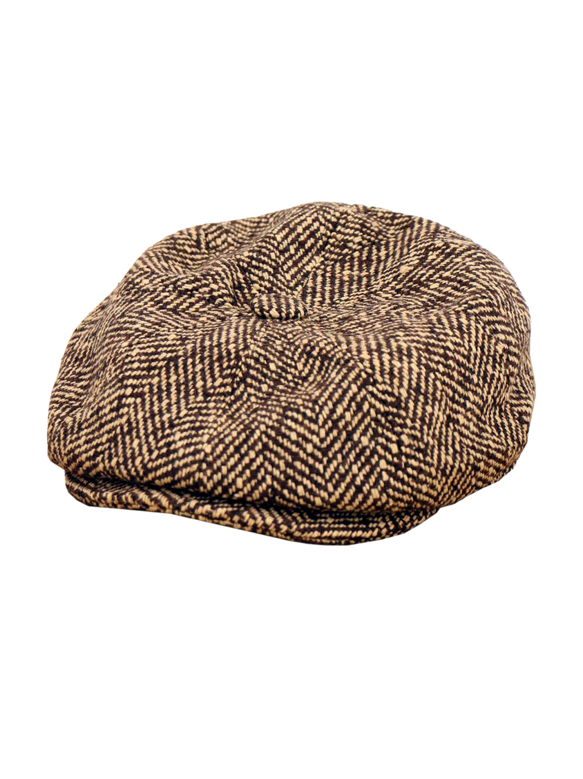 Authentic 1920s to 40s style 8-panel newsboy cap in a brown and white flecked Herringbone tweed.