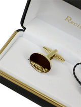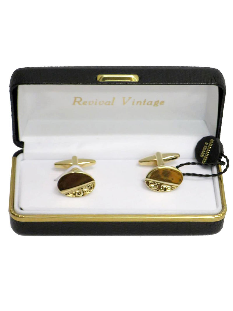 Gold plated oval cufflinks with a refined engraved pattern along the lower edge. A timeless vintage inspired design with swivel catches for secure fastening. Presented in a Revival black presentation box.