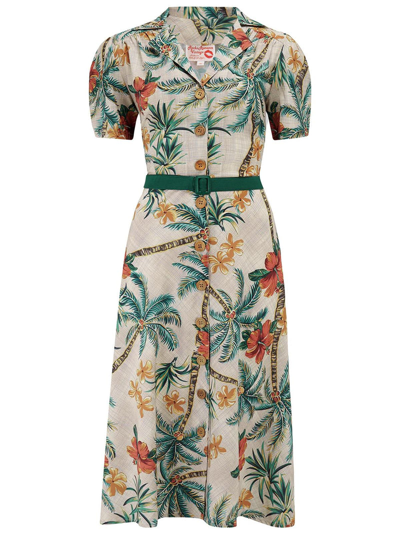 This midcentury inspired shirt dress features a vibrant tiki palm print on a soft, crepe-feel fabric, the perfect blend of comfort and retro charm. Coordinating brown buttons and a matching green fabric-covered belt complete the authentic vintage look.