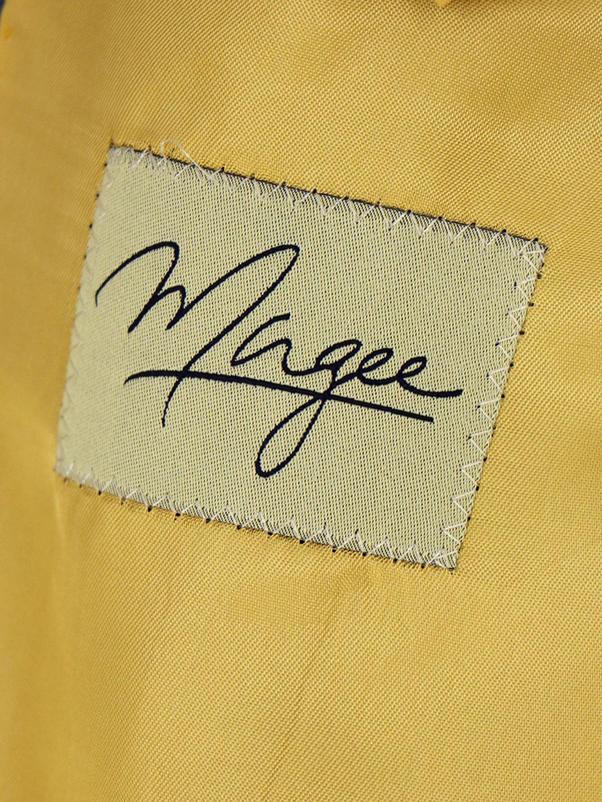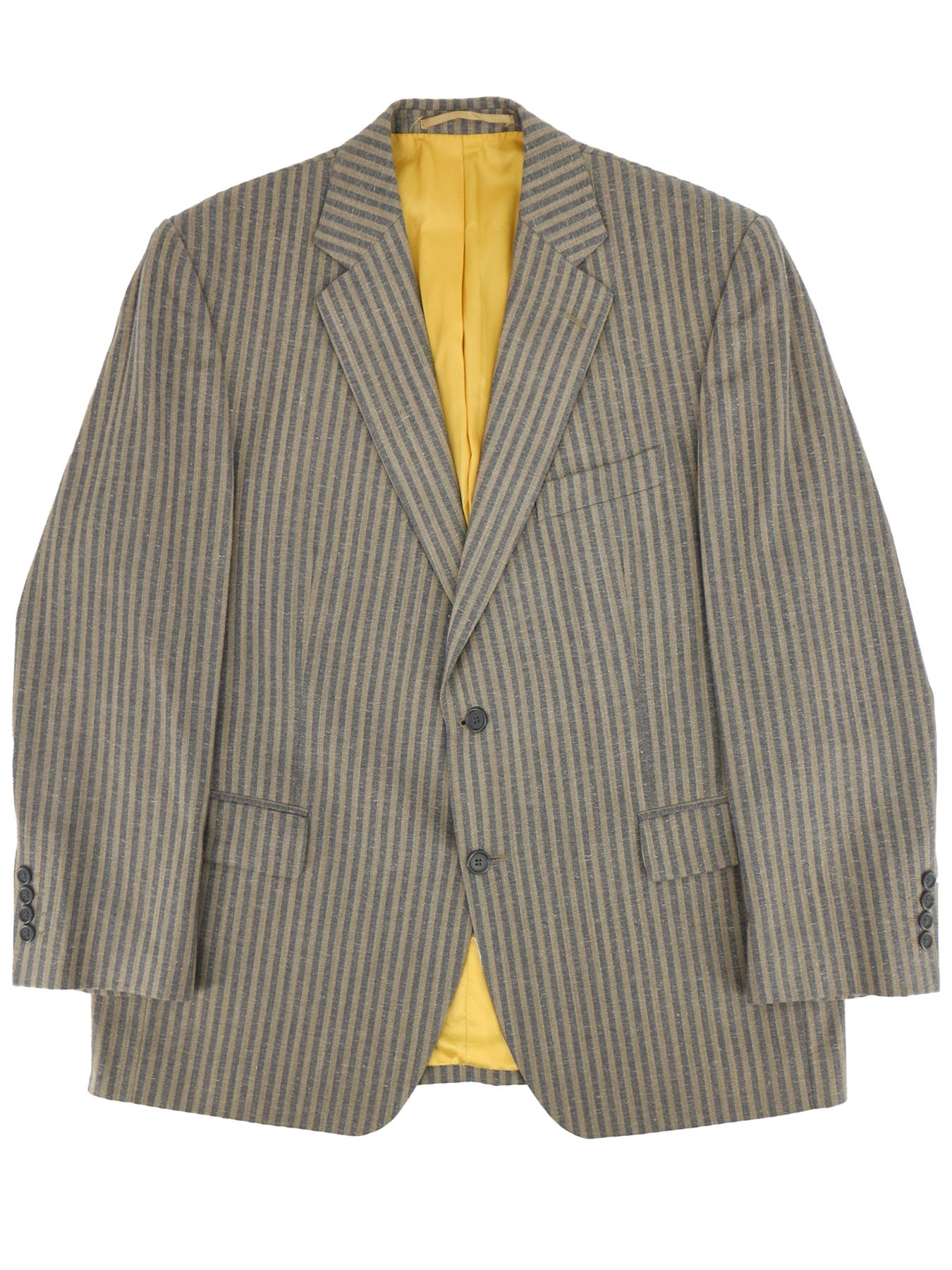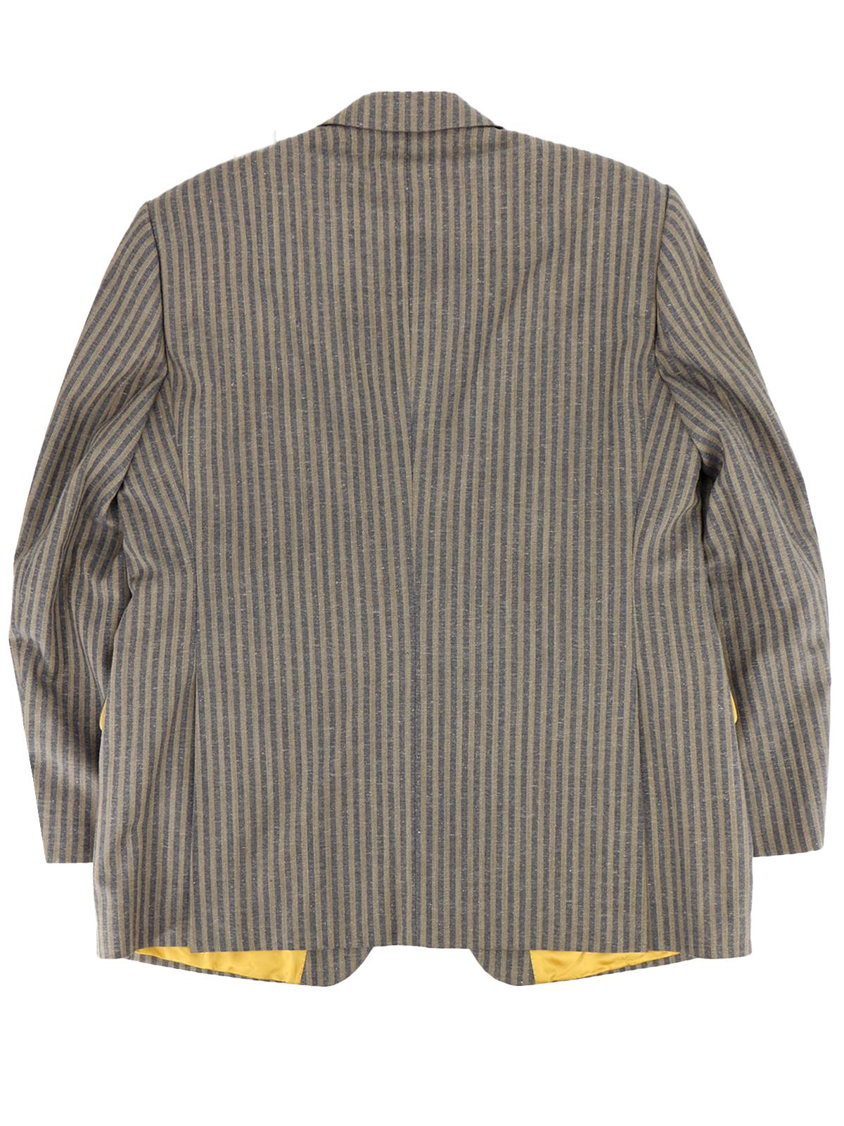 A boating blazer jacket, realised in muted navy blue and grey stripes with a contrasting mustard lining.