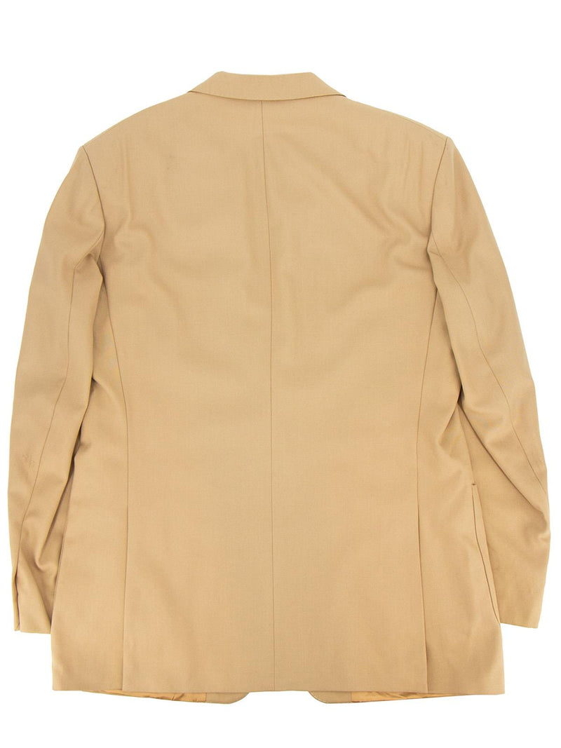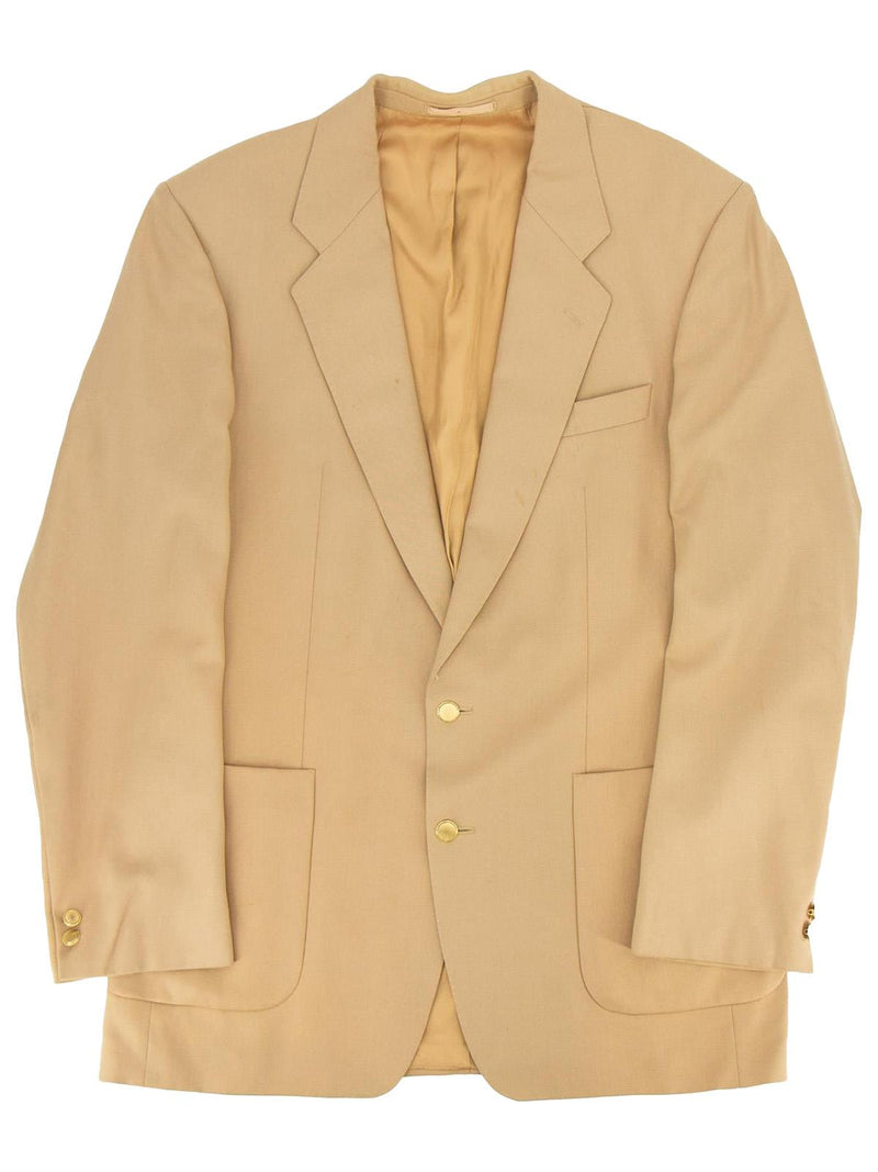 Designed with simple elegance, it features two gold-tone buttons to fasten and matching buttoned cuffs. The front patch pockets add a relaxed yet refined finish. Light staining present (as shown in photos), likely to launder. The blazer is slightly longer in length, making it ideal for the taller gentleman.