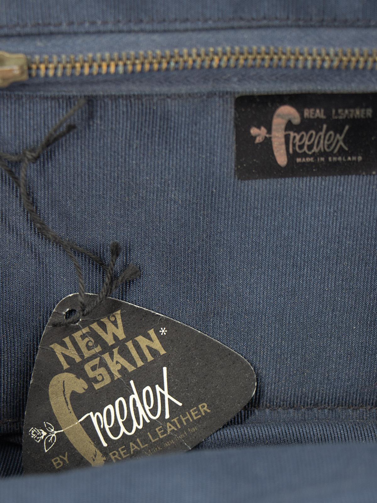The interior is lined in matching navy blue fabric with one zipped pocket and original tag.