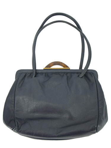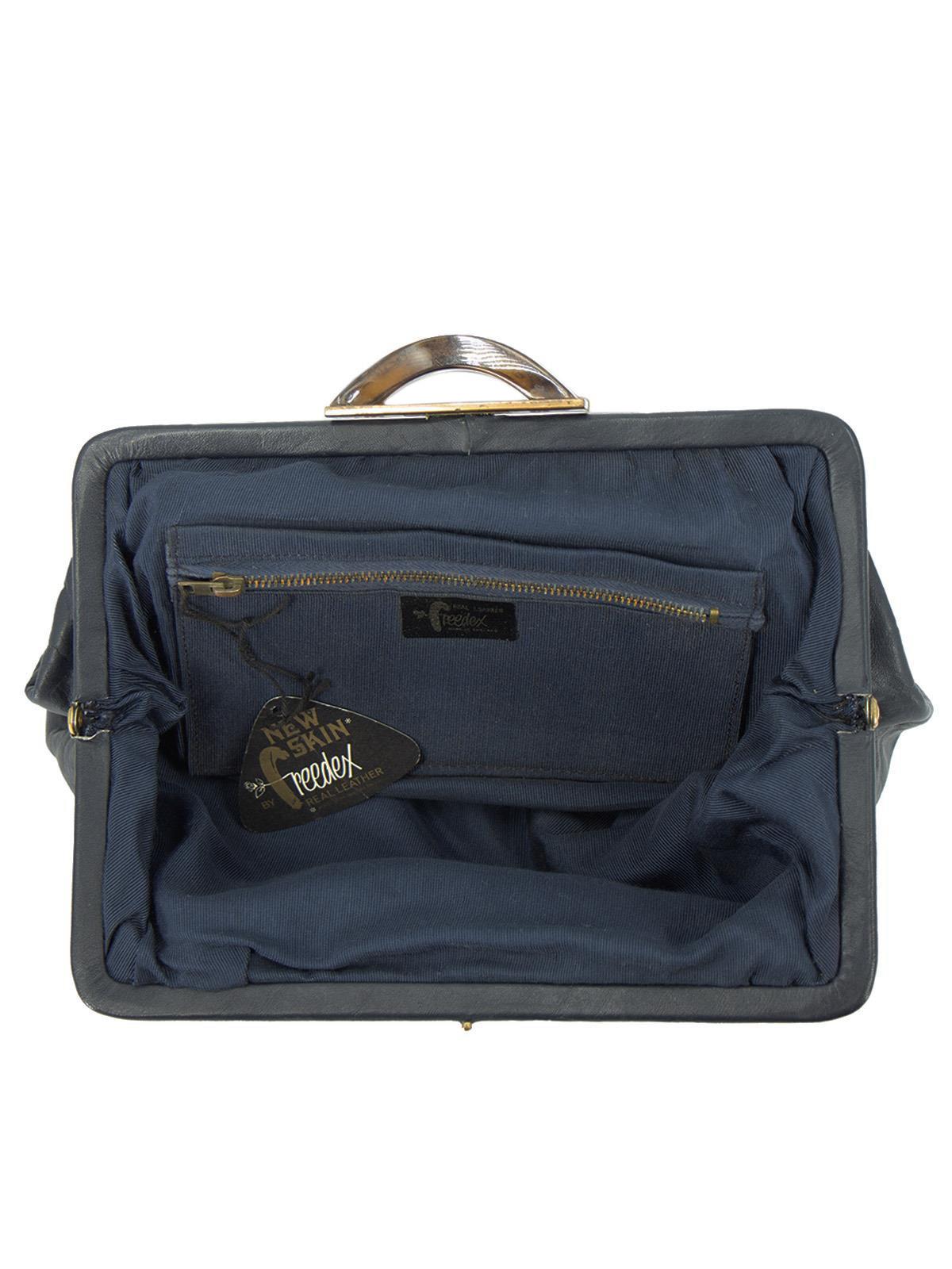 An original vintage "Freedex" frame bag made from wonderfully soft real leather. The frame is clad in matching leather and the clasp is an unusual brown tone perspex with gold hardware. This classic style with two top handles would complement all midcentury fashions and is a great size for modern-day essentials.