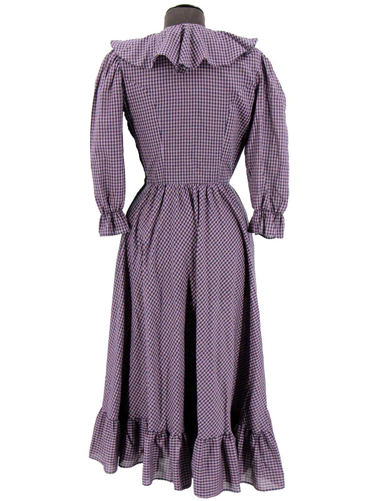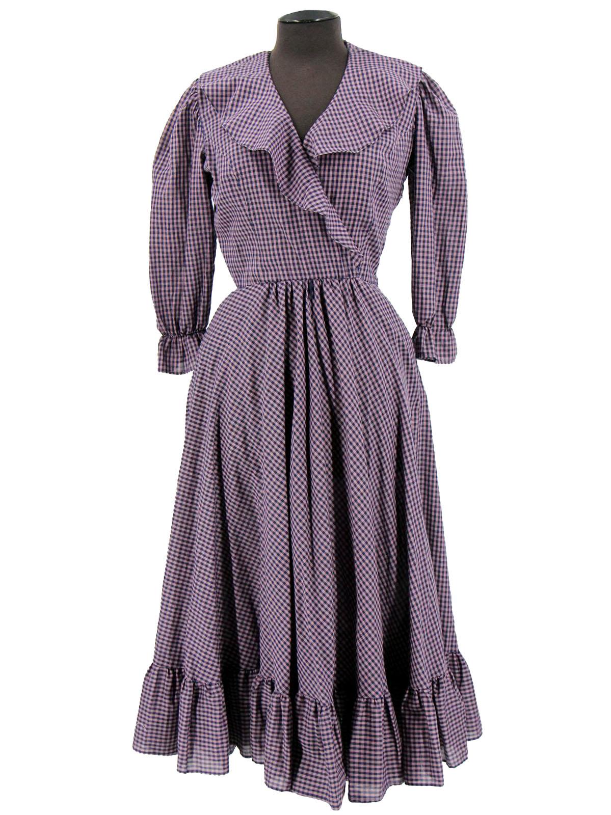 This seventies or eighties era vintage dress is made of a lightweight cotton fabric which is patterned with purple and navy gingham check.