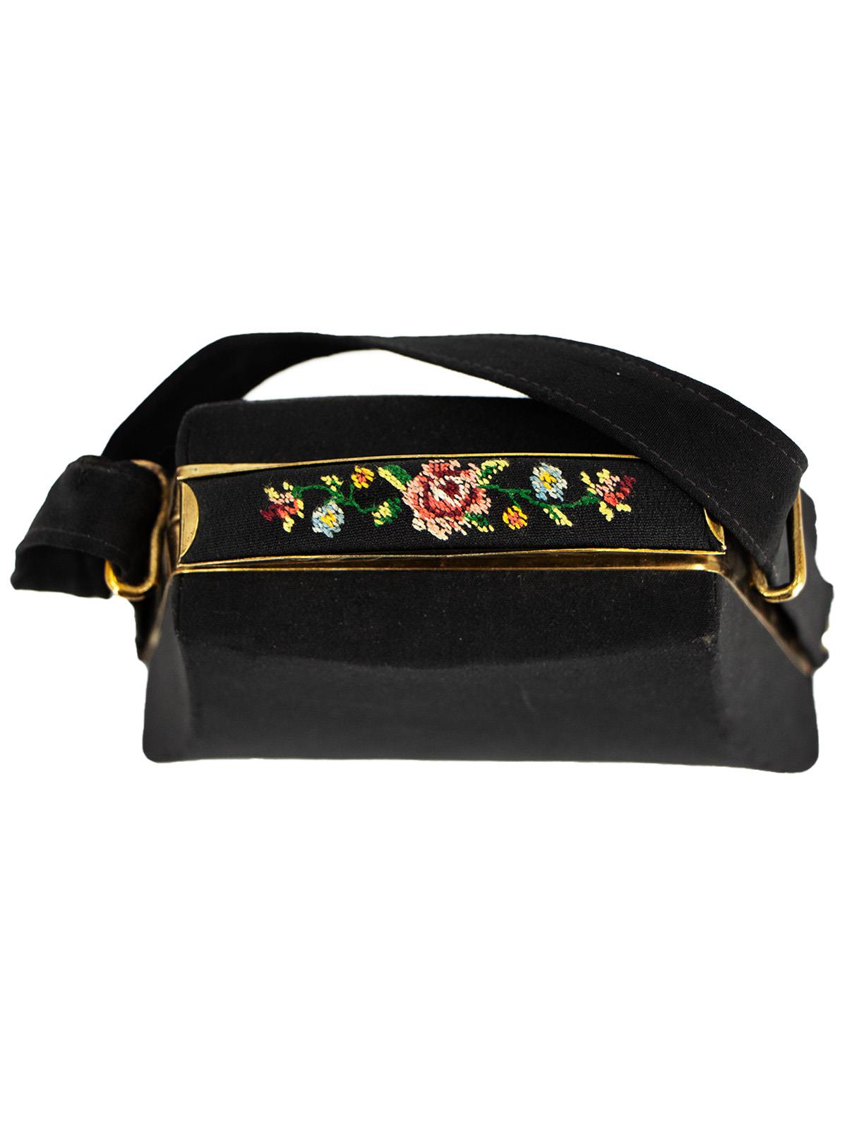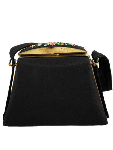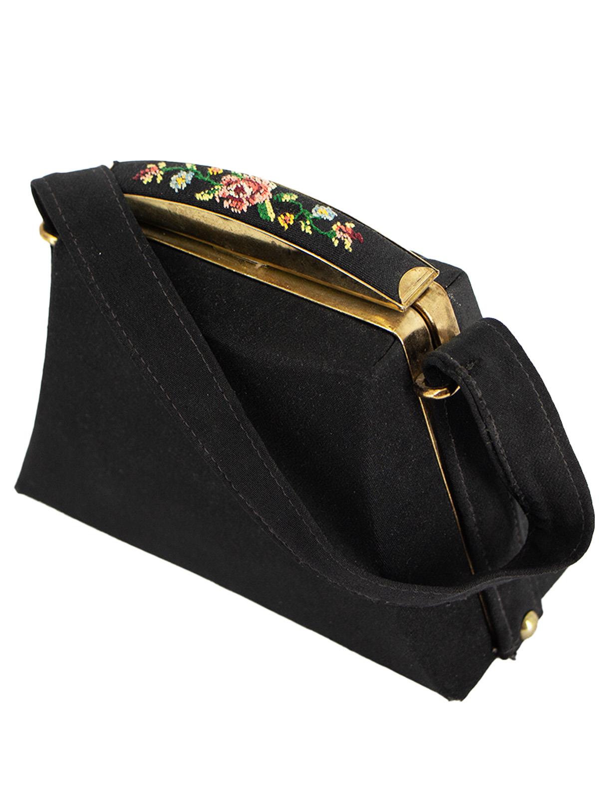 Vintage Small Black 1940s Petit Point Embroidered Top Handle Bag