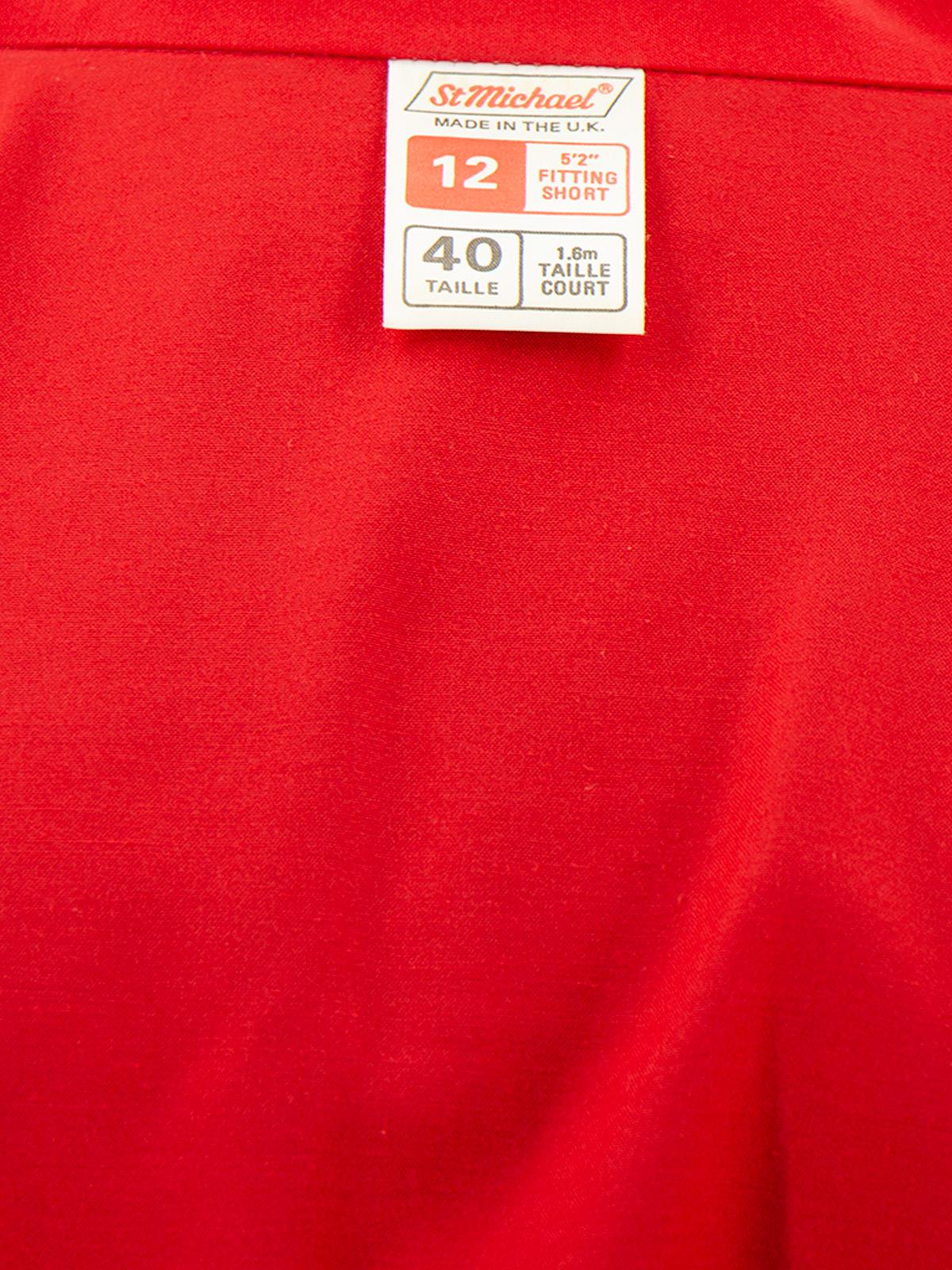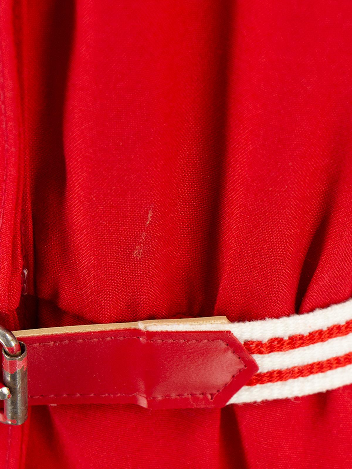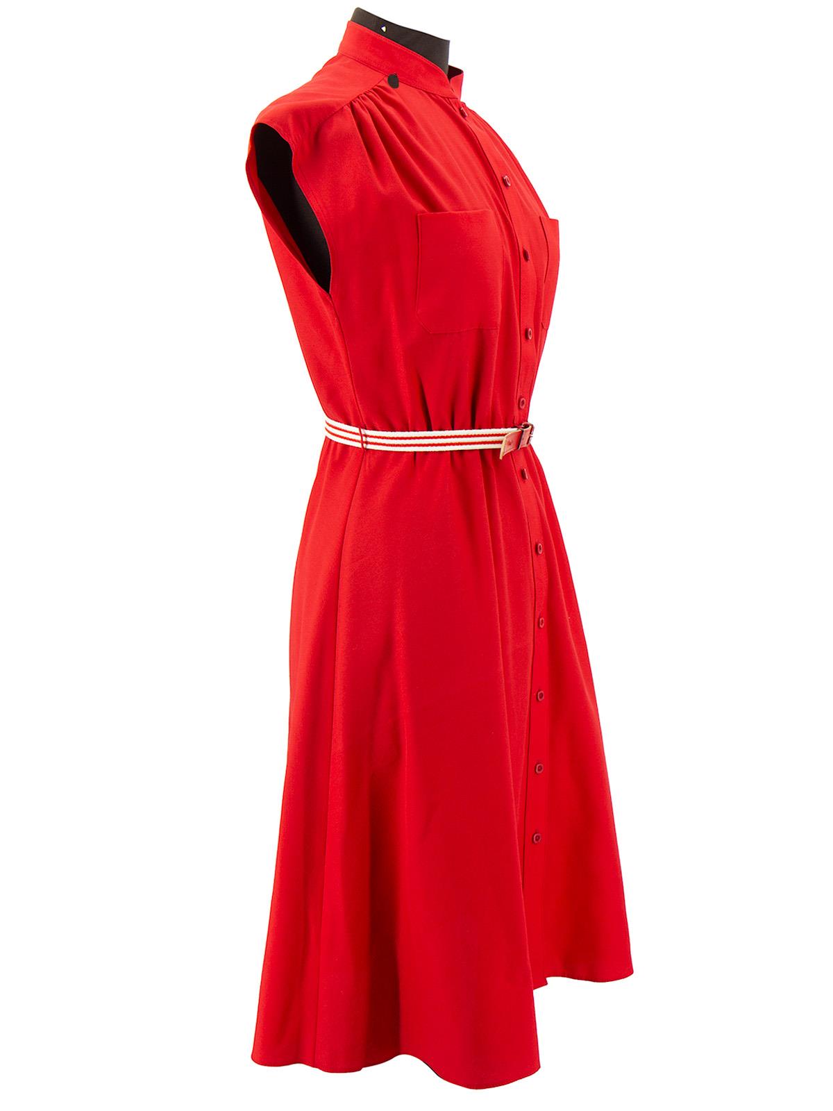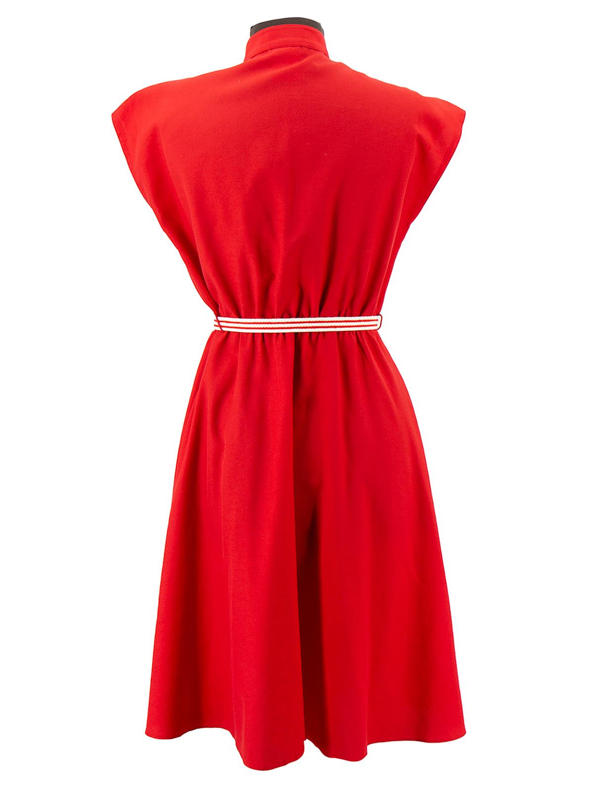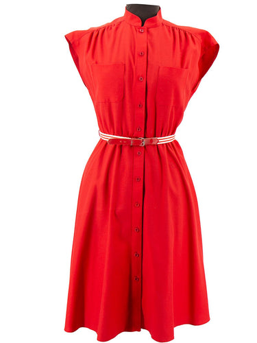This striking red sleeveless day dress is vintage St Michaels circa 1970s 1980s. It comes with a co-ordinating red and cream striped belt to cinch the waist and a mandarin collar to flatter the neckline.
