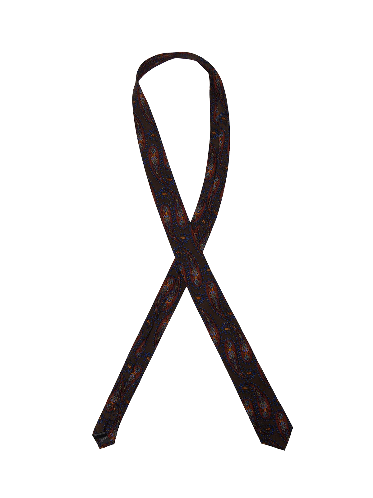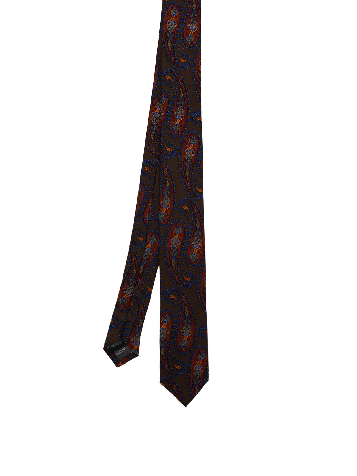 A vintage style 100% silk skinny tie in a classic paisley print. A wonderful rich colour palette of deep chocolate browns and dark reds with pops of sapphire blue and sunset orange. There is a beautiful sheen to the silk and this would look great with either a brown or blue knit or paired with a suit.