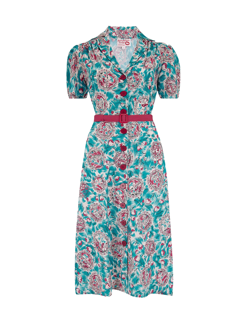 This retro dress features a button-through design with oversized buttons, short sleeves, and an A-line skirt that hits approximately below the knee. The print is a copy of a vintage 1950s-era fabric, with 'cameos' depicting scenes from country life, including boats, horses, picnics and cottages on a green and cream background. The dress is accented with a deep red shade.