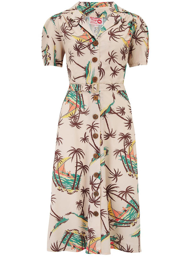 This gorgeous vintage style dress features an iconic Hawaiian print which is a direct copy of a true vintage 1950s era fabric.