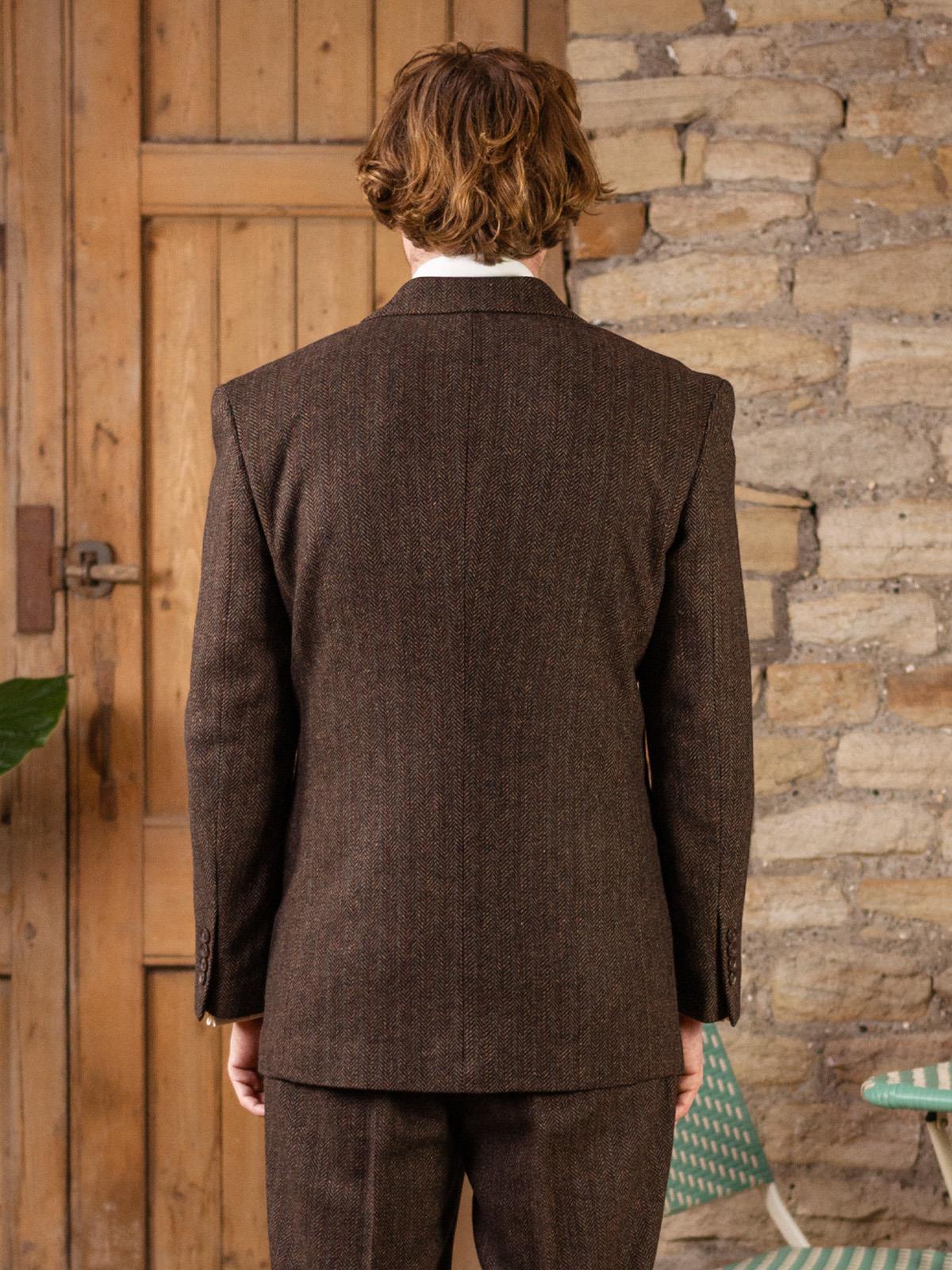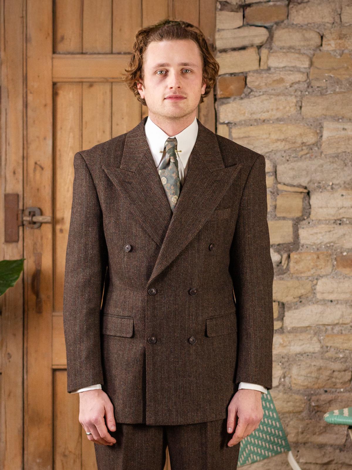 Our much sought-after demob suit returns in a brown herringbone weave. At first glance the fabric appears to be classic brown, but the herringbone also features multicolour flecks of green, mustard, brown and charcoal, with fine pinstripes of teal blue and maroon brown. It delivers the timeless style of the forties with a fresh, versatile finish.