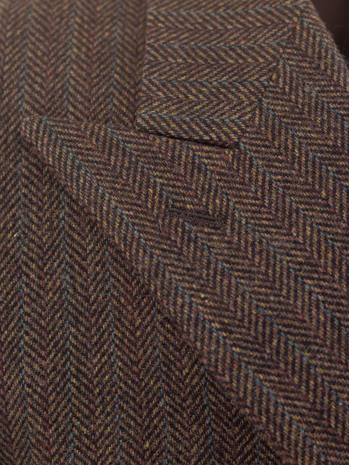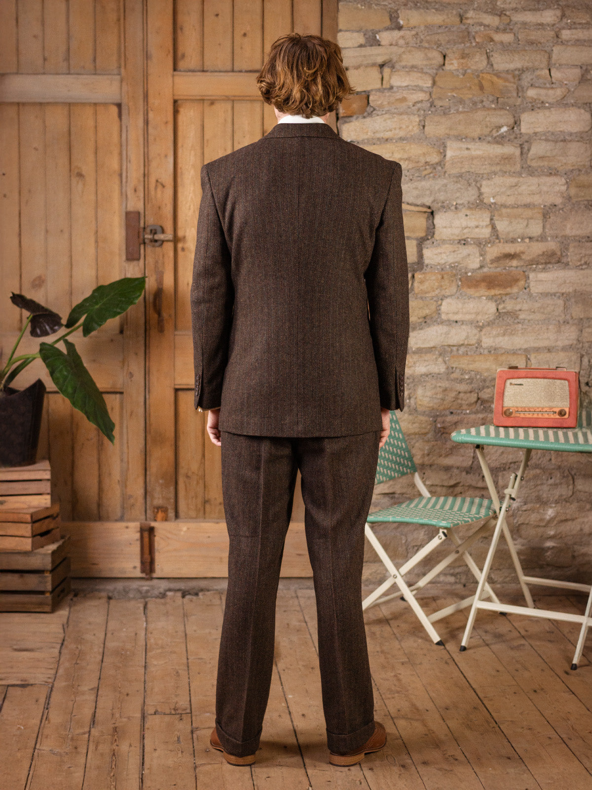 Our much sought-after demob suit returns in a brown herringbone weave. At first glance the fabric appears to be classic brown, but the herringbone also features multicolour flecks of green, mustard, brown and charcoal, with fine pinstripes of teal blue and maroon brown. It delivers the timeless style of the forties with a fresh, versatile finish.
