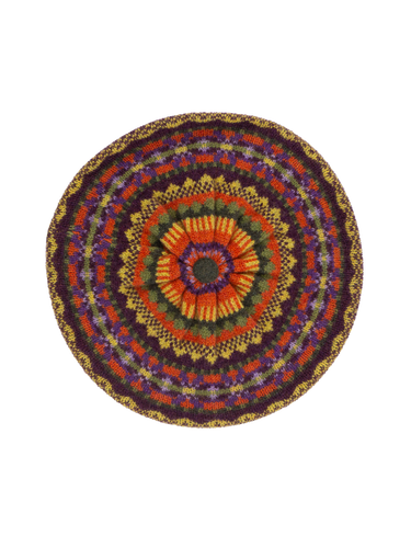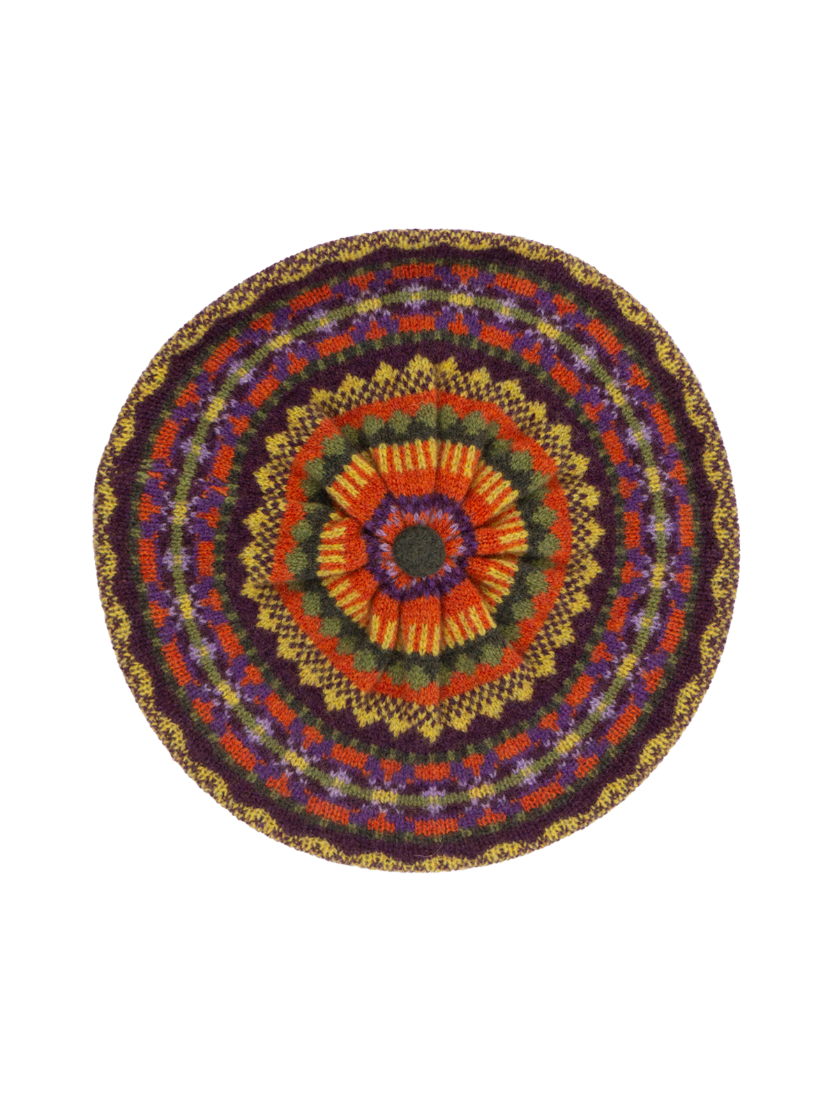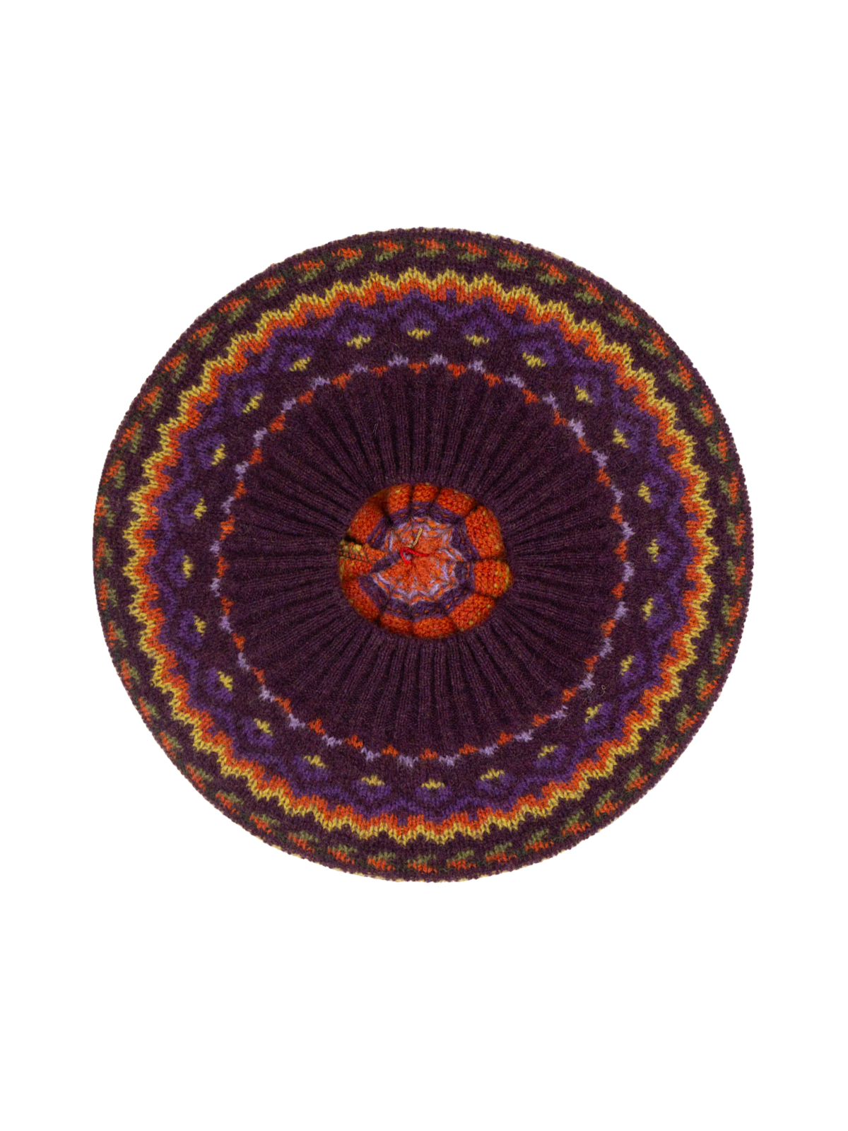 Vintage style wool beret, in a forties style with a bright Fairisle pattern featuring tonal greens and purples with flashes of yellow and orange.