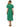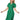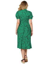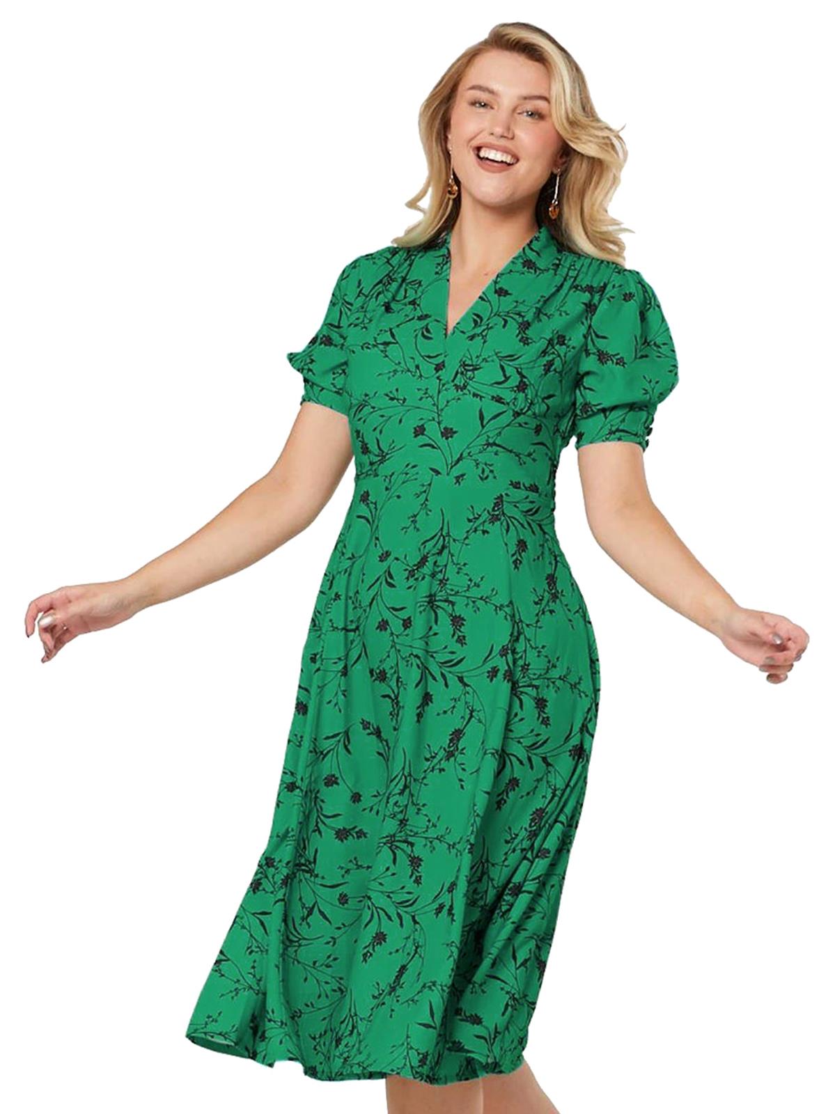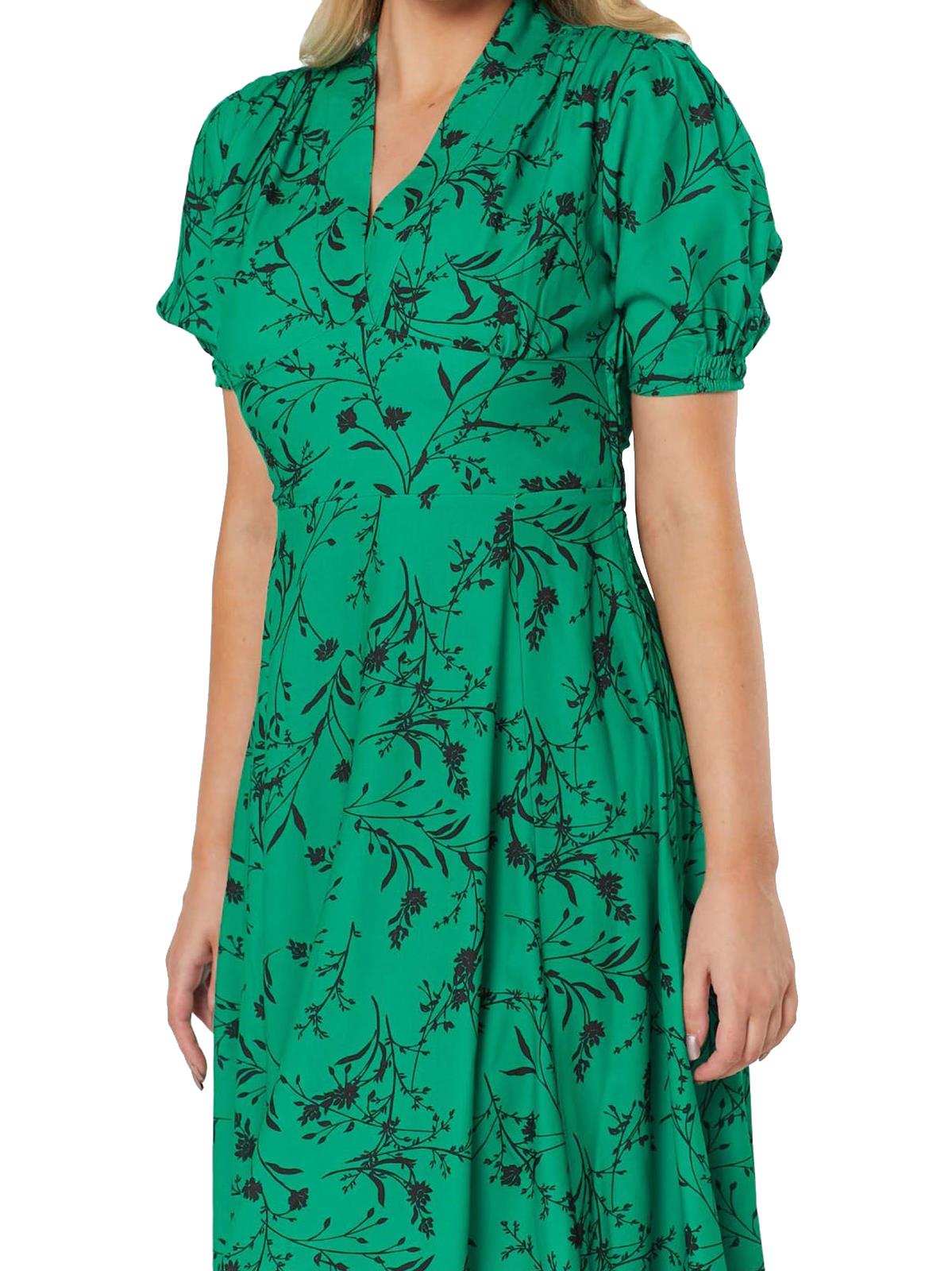 Emerald green summer dress with a crossover V-shaped neckline, elasticated puff sleeves, and a floaty A-line midi skirt. Made of light synthetic fabric with a delicate all-over black floral pattern, ideal for summertime