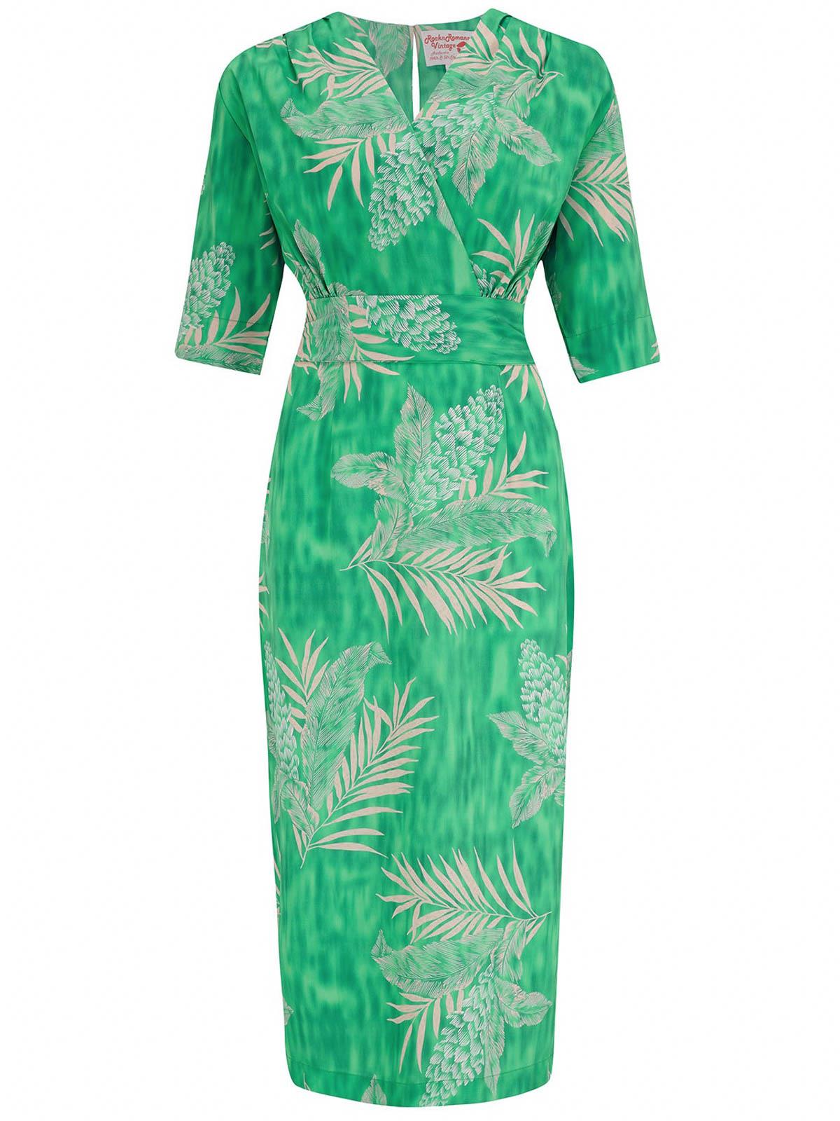 A vintage style wiggle dress in a bold and beautiful emerald green, patterned with tropical palm leaves. dress is a bright lipstick red and has striking soutache trim shaped into charming loops across the collar, sleeve cuffs and decorative pockets, sure to make it a stand-out piece in the wardrobe of a vintage fashion lover.