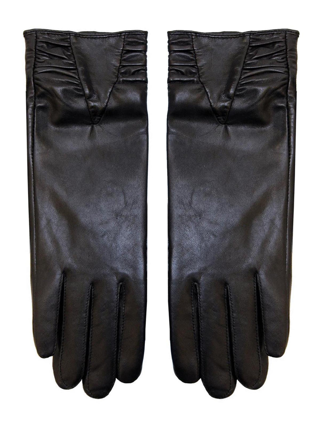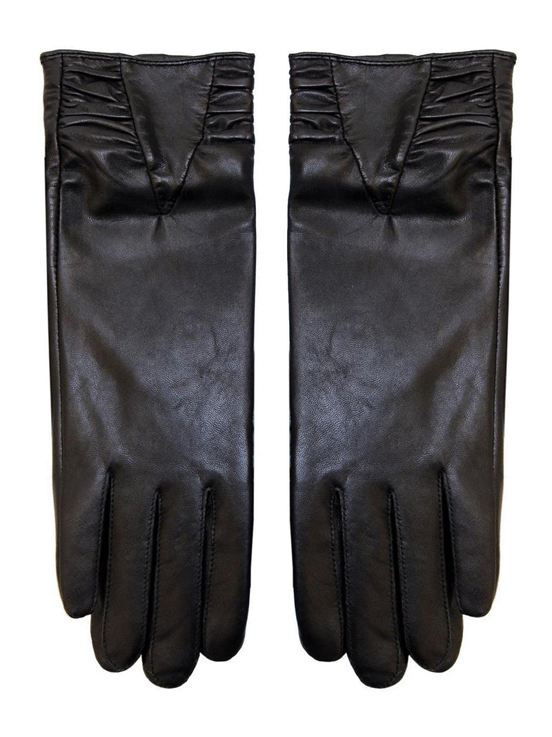 Vintage style long black leather gloves. Soft real leather retro gloves with gathering and an inset V feature. A longer length to tuck under your cuffs & give you an authentic vintage fashion touch. Black moleskin like lining.