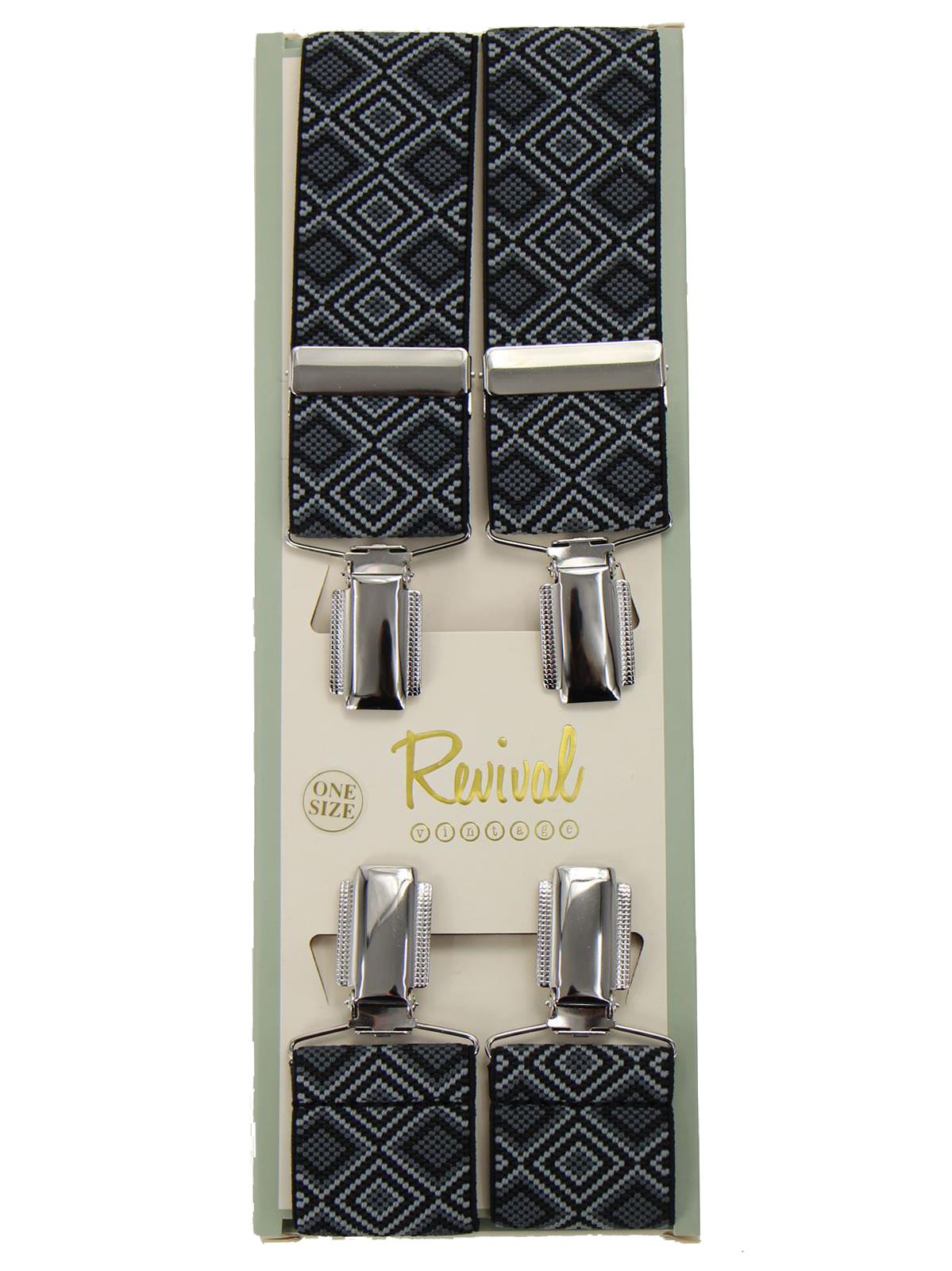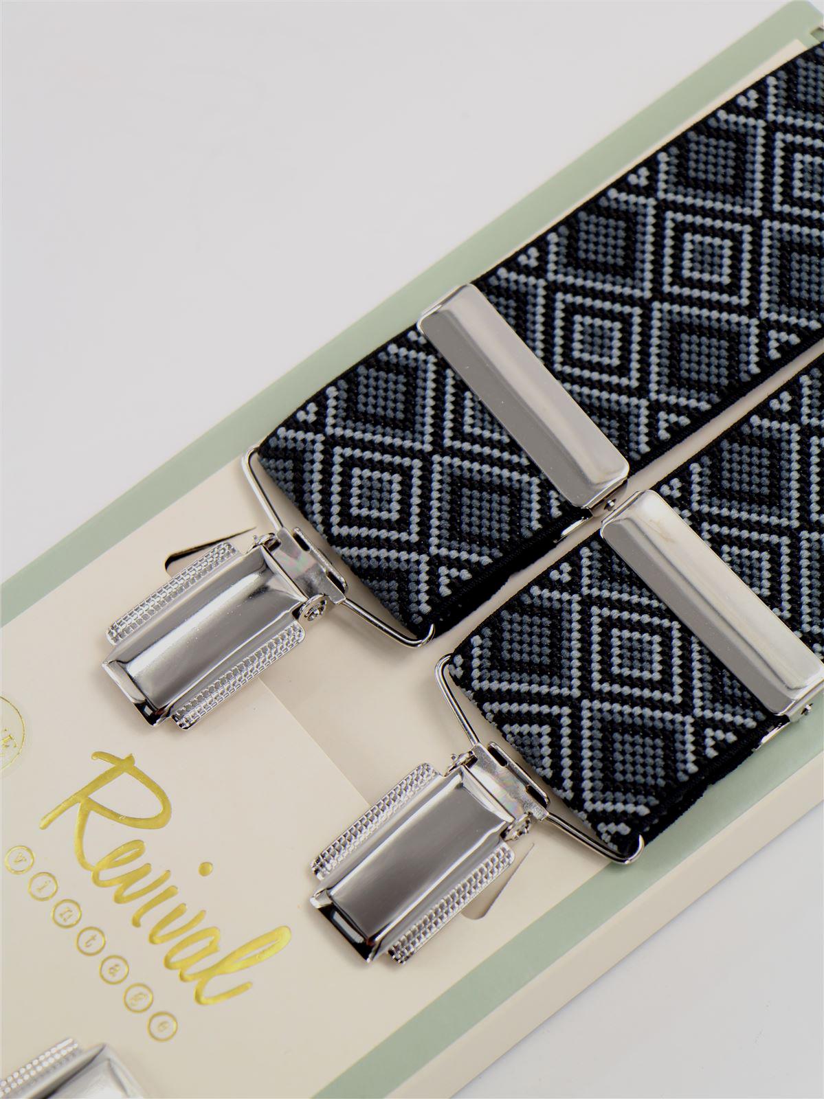 Huddersfield made vintage style braces in black, white and greys diamond design.