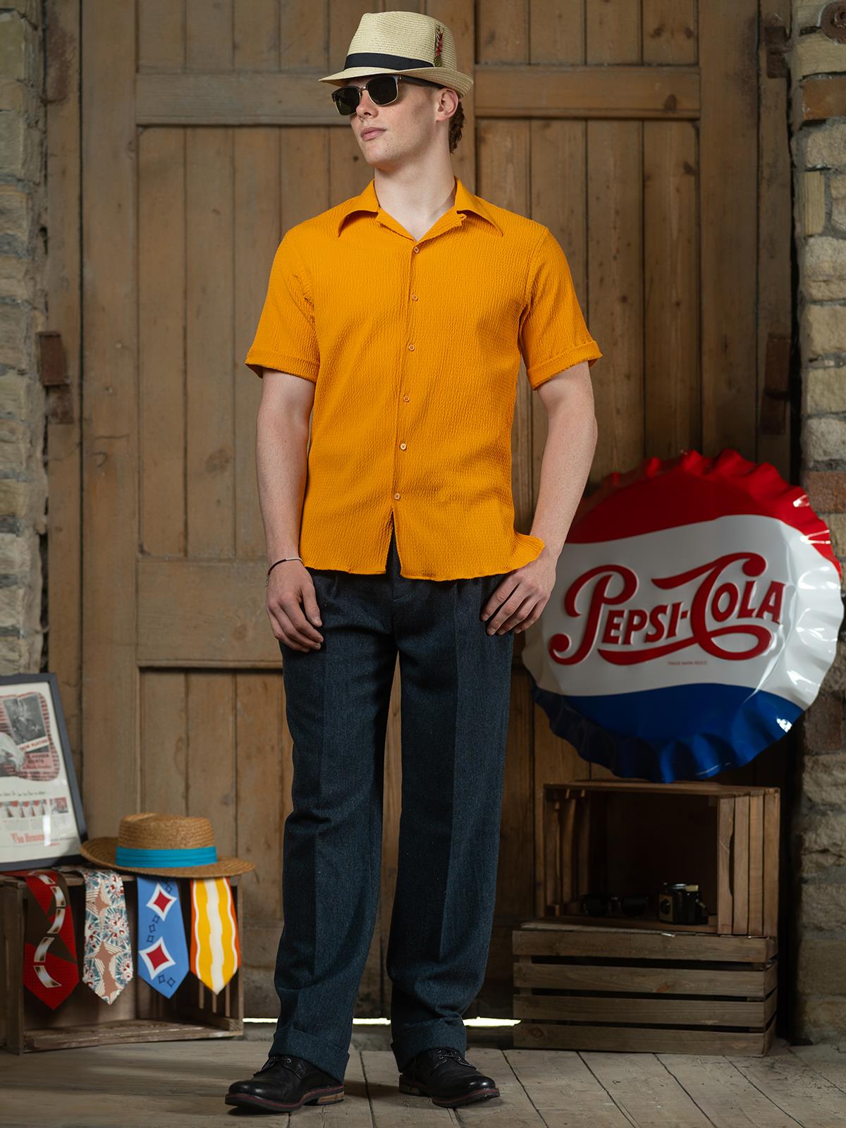 This men’s seersucker leisure shirt is a sunny orange shade, designed with inspiration from 1940s and 50s pieces. A versatile and practical choice for hot weather that will retain a timeless midcentury fashion sense.