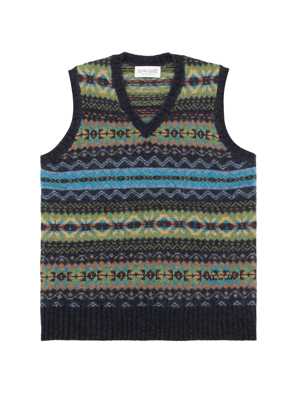 This sleeveless sweater vest is made of soft Shetland wool, woven in a Fairisle pattern that gives it a classic 40s look. Hand-produced in Scotland using quality, natural yarns spun that keep you truly warm, by ERIBÉ, an established knitwear design house and manufacturer that has been in operation for 33 years.