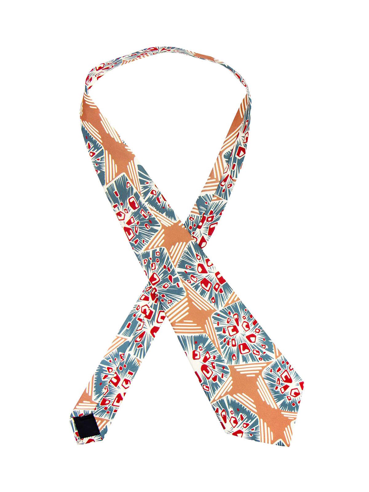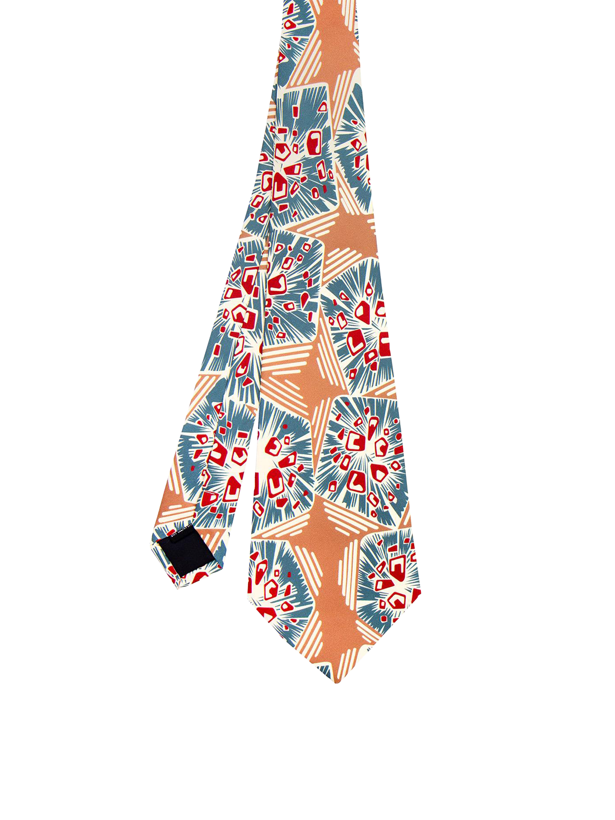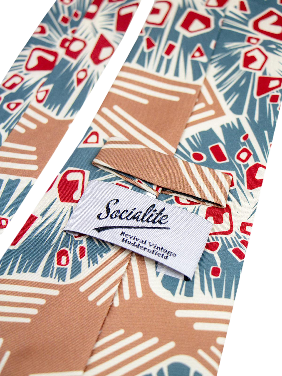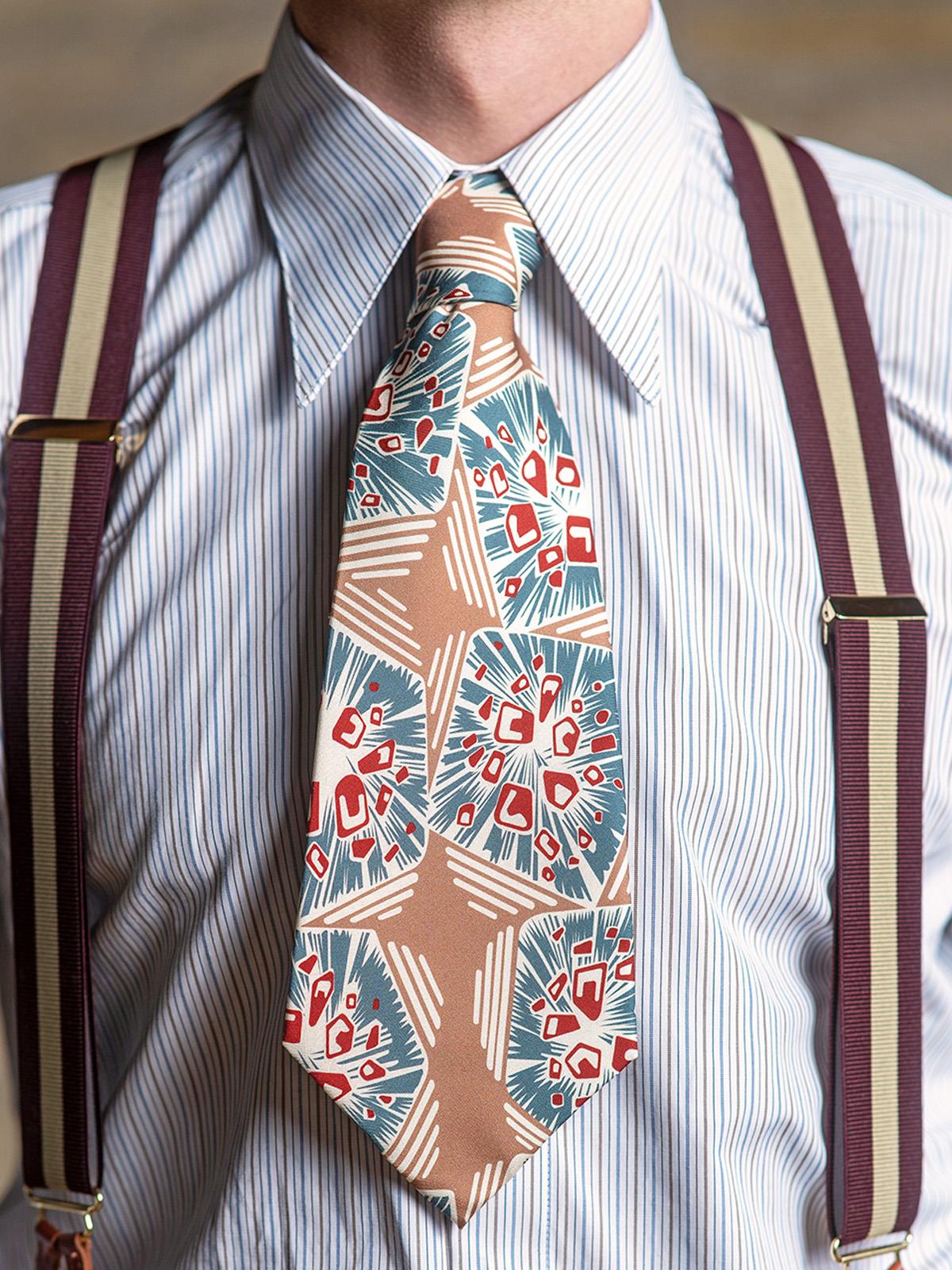 An American style swing tie reproduced under our Socialite label, inspired by one of our authentic 1940s originals. Featuring a truffle brown base with a bold teal, red, and cream exploding fragment pattern, this midcentury design coordinates perfectly with 1940s and 1950s clothing. Handmade in the UK from high-quality silk.