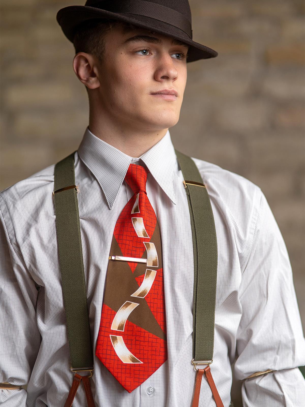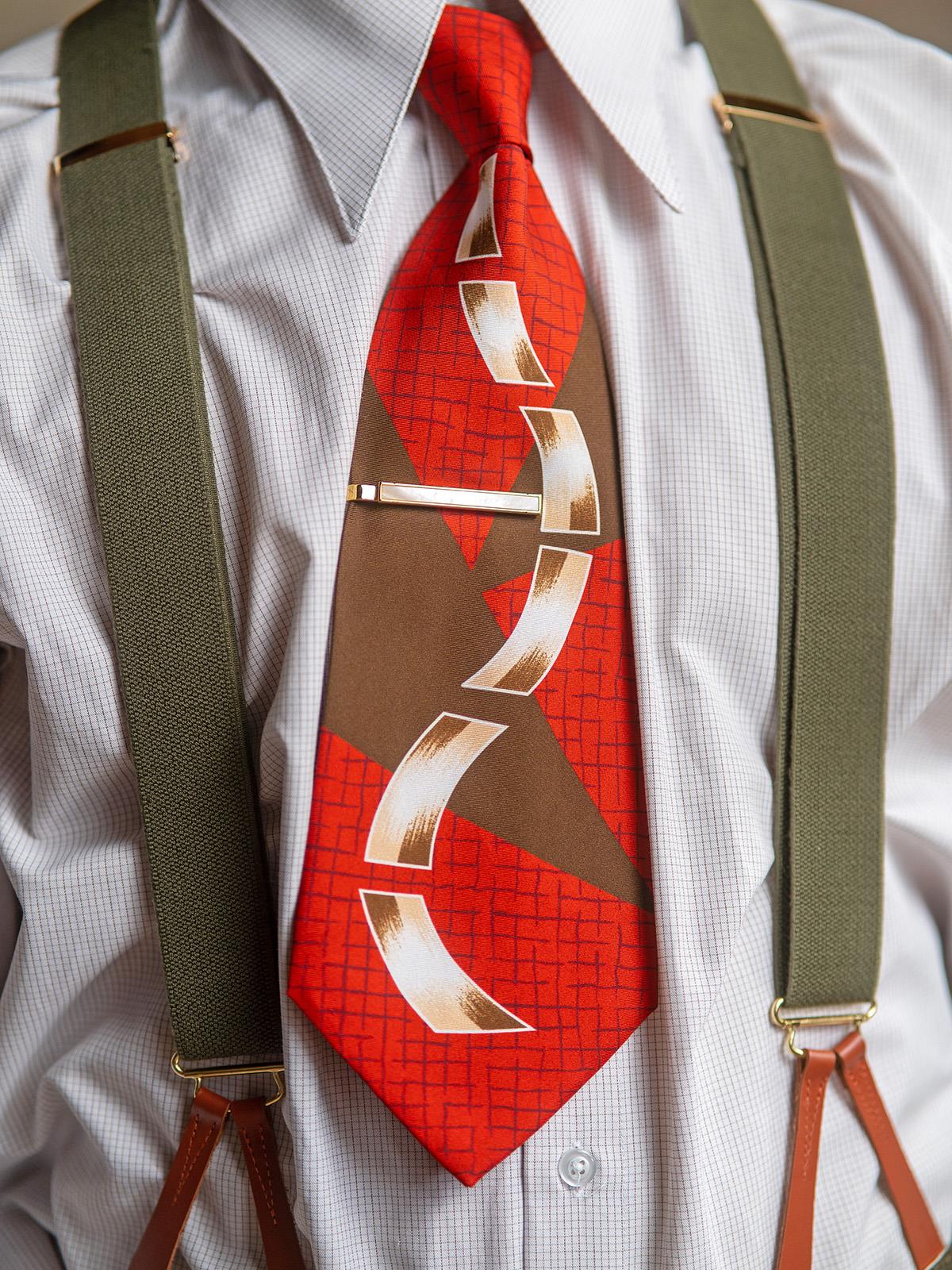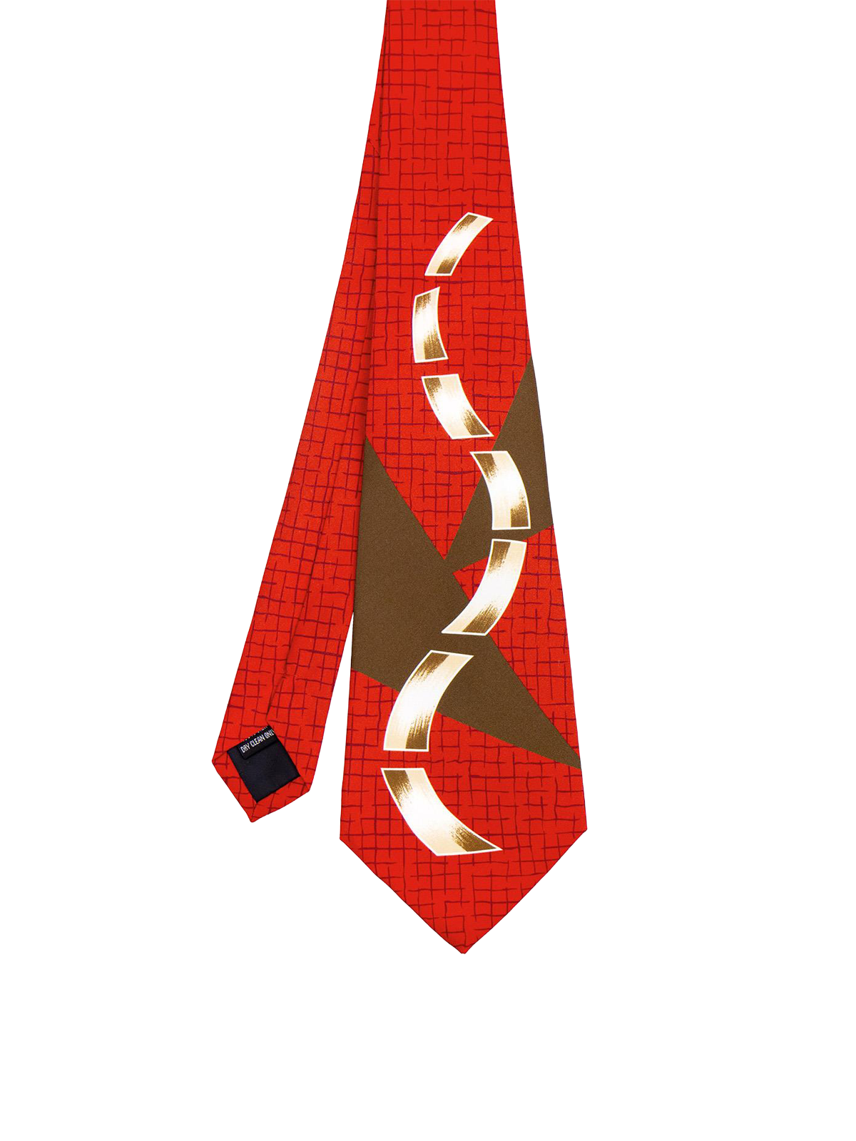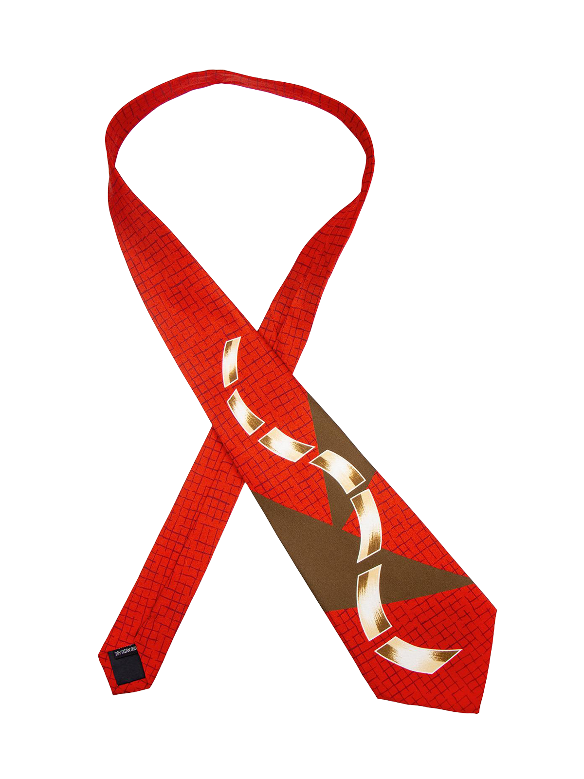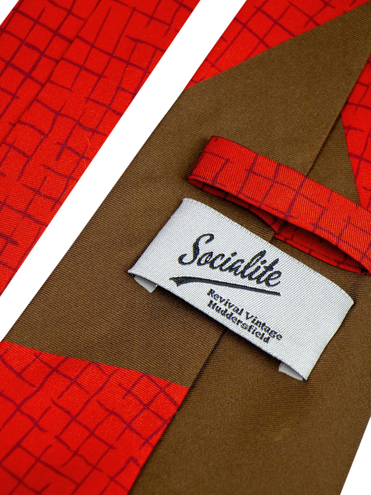 A superb American style swing tie reproduced under our Socialite label, based on one of our authentic 1940s originals. Featuring a rust red background with a broken check design, topped with a bold dark brown triangle and ribbon frontmost pattern. An authentic midcentury piece to set your 1940s and 1950s clothing apart. Handmade in the UK from high quality silk.