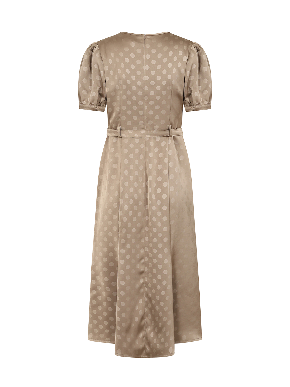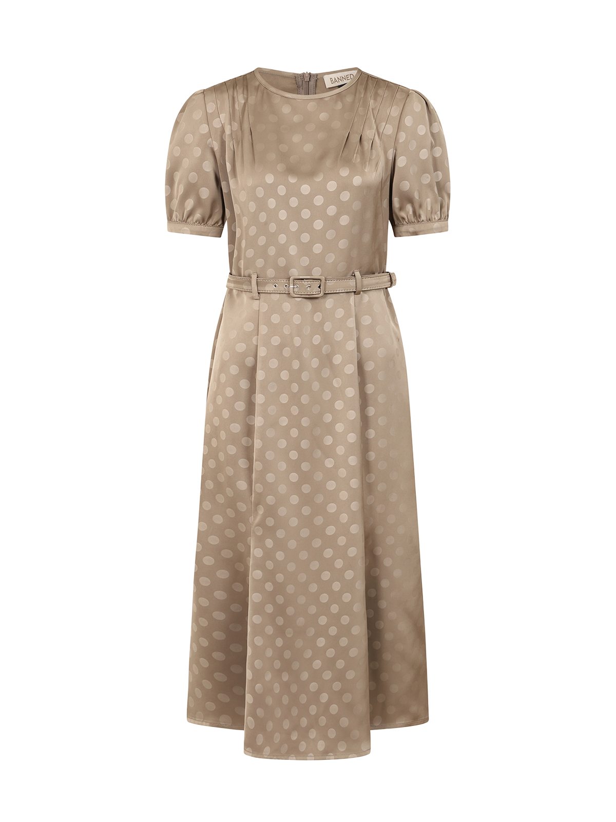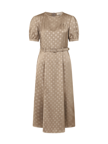 This elegant taupe midi dress in silky satin with tonal polka dots, is perfect for vintage occasion wear. Features pleated shoulders, short puff sleeves, and a matching fabric belt for a flattering waistline.