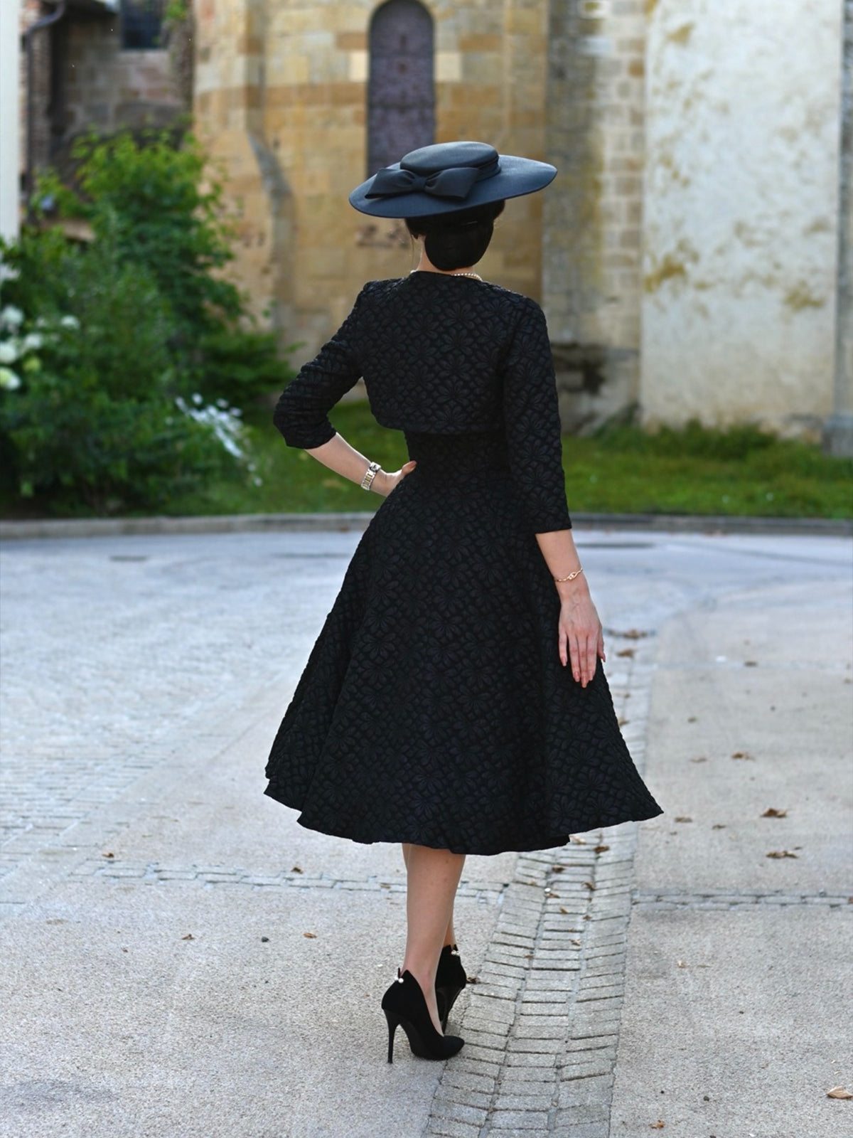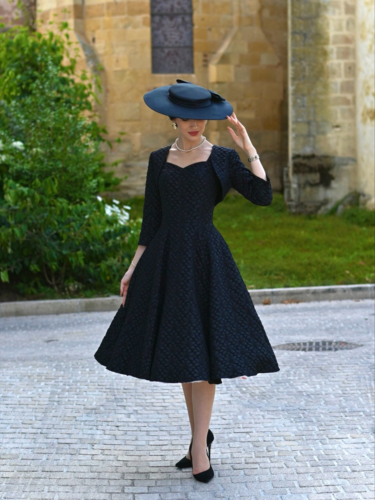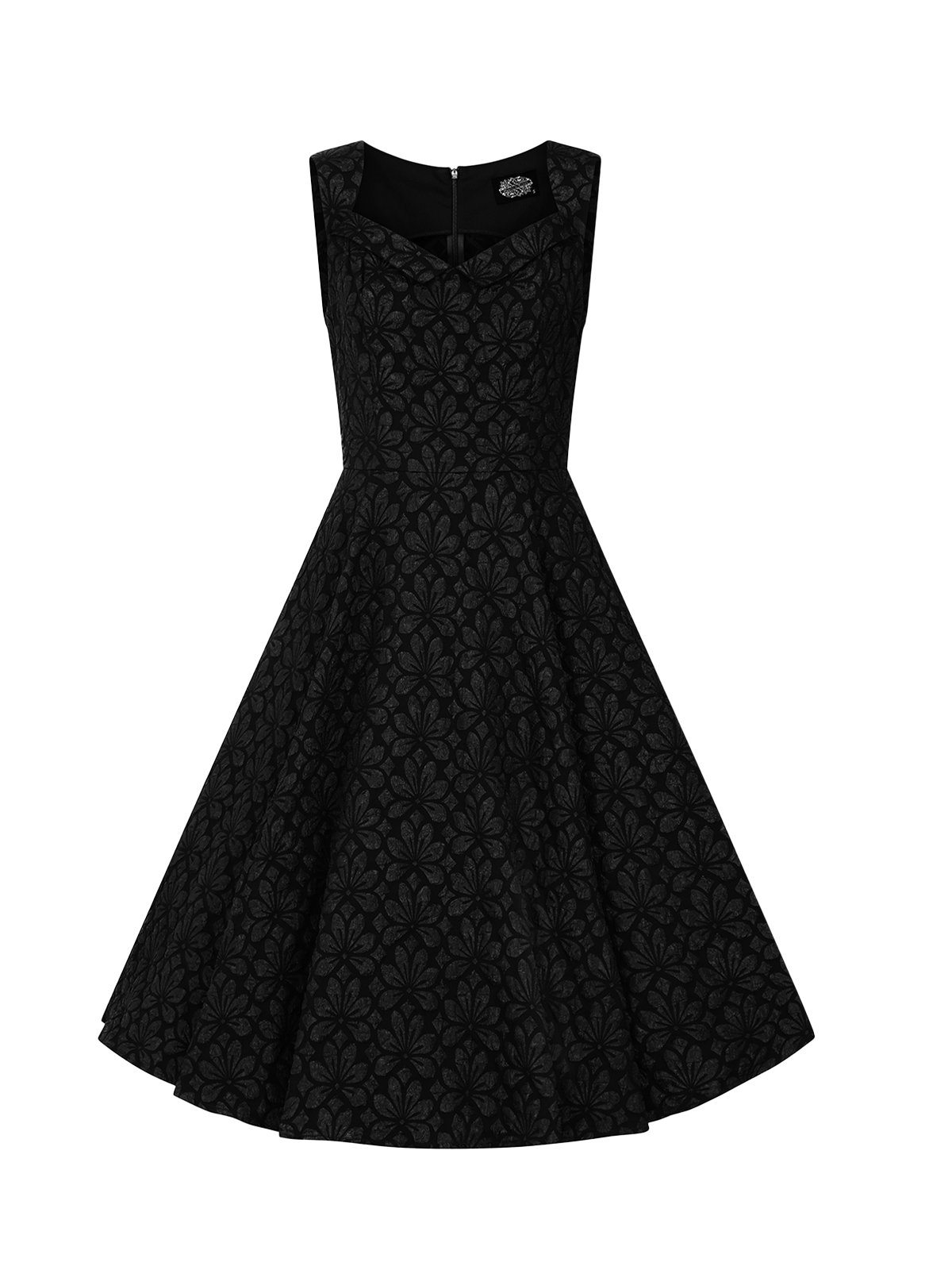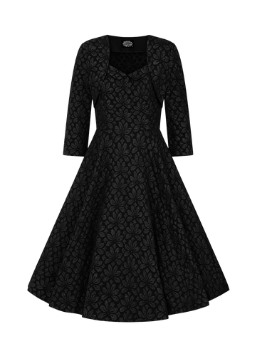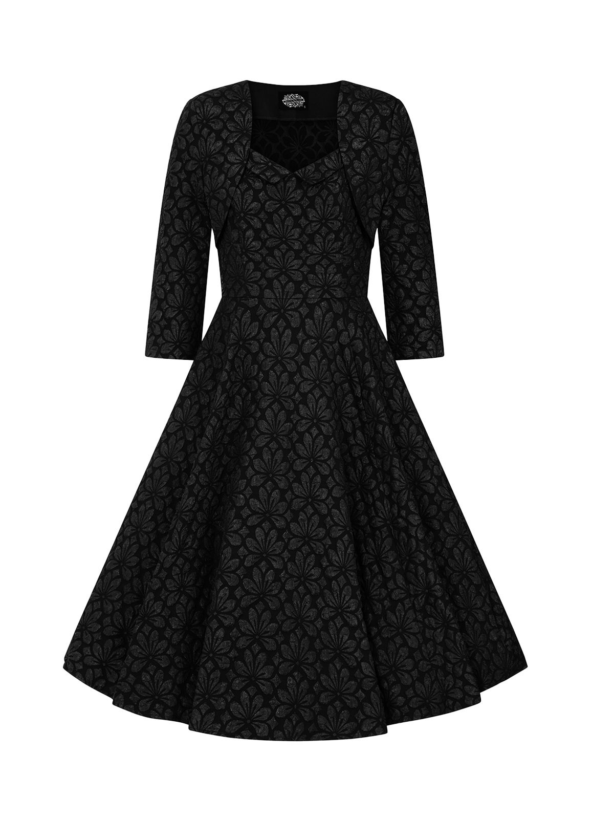 A vintage inspired swing dress in black with an embossed floral print. The fitted bodice shapes the waist, flowing into a full swing skirt for a classic 1950s look. A lapel neckline adds retro detail, and the matching bolero completes the outfit with elegance.
